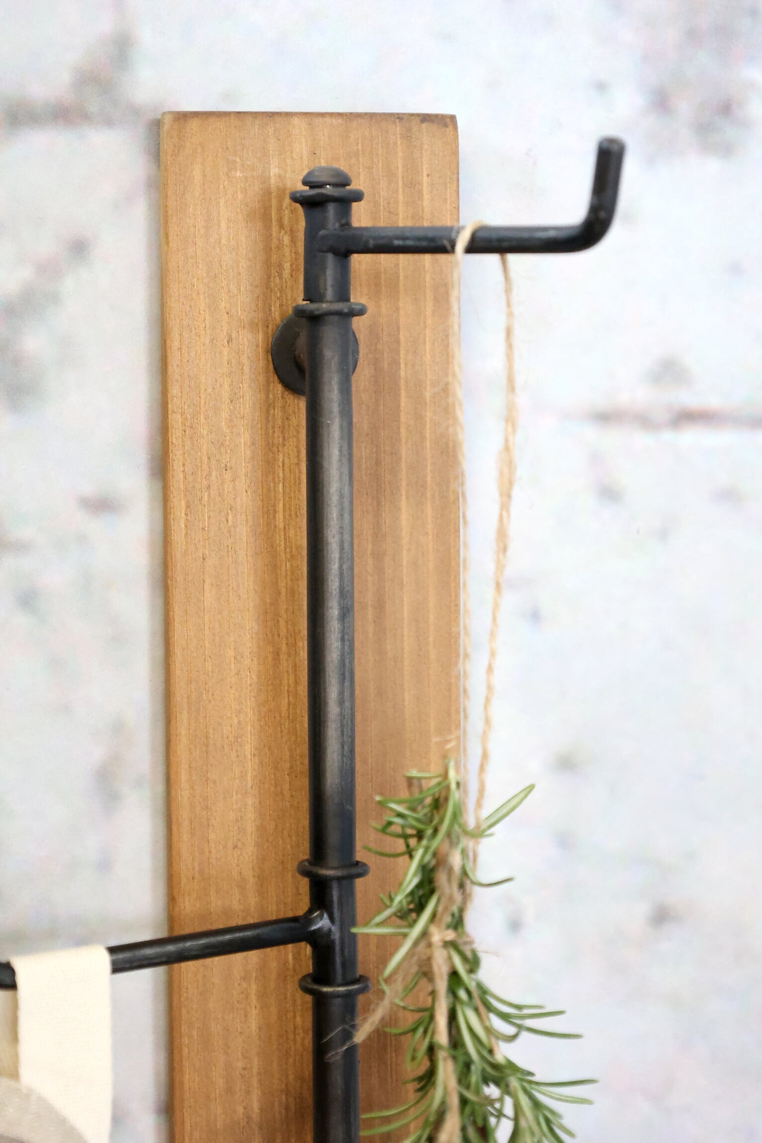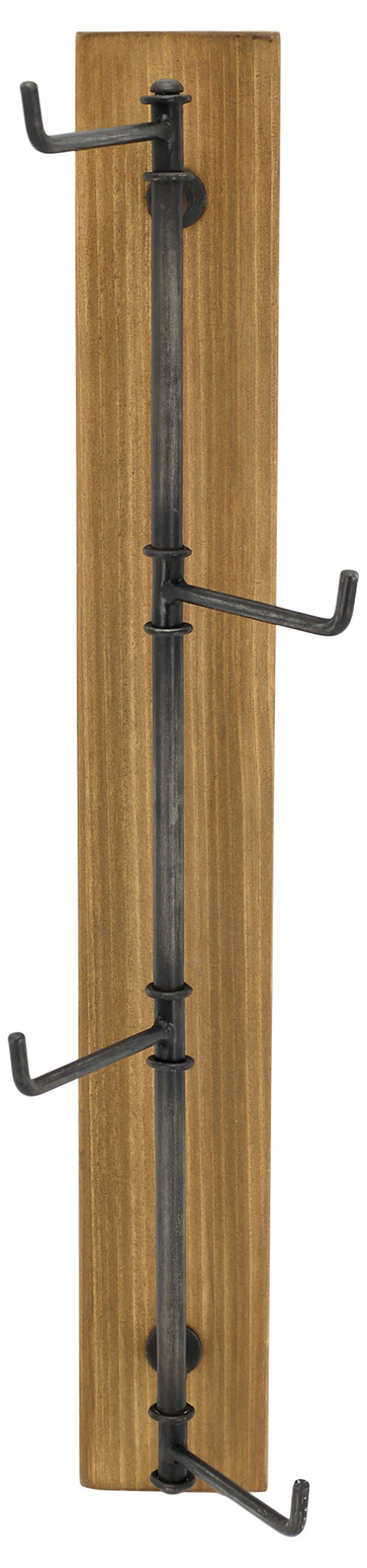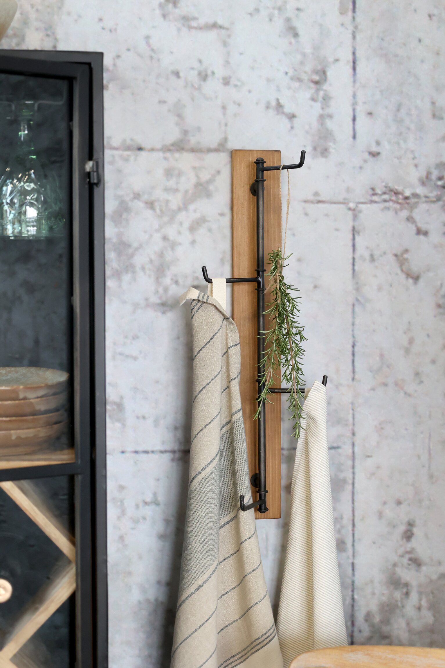 Stilren klädhängare som kombinerar naturligt trä med mörka metallkrokar. De välplacerade krokarna gör det enkelt att hålla ordning på sådant du vill ha nära till hands – utan att det känns rörigt.