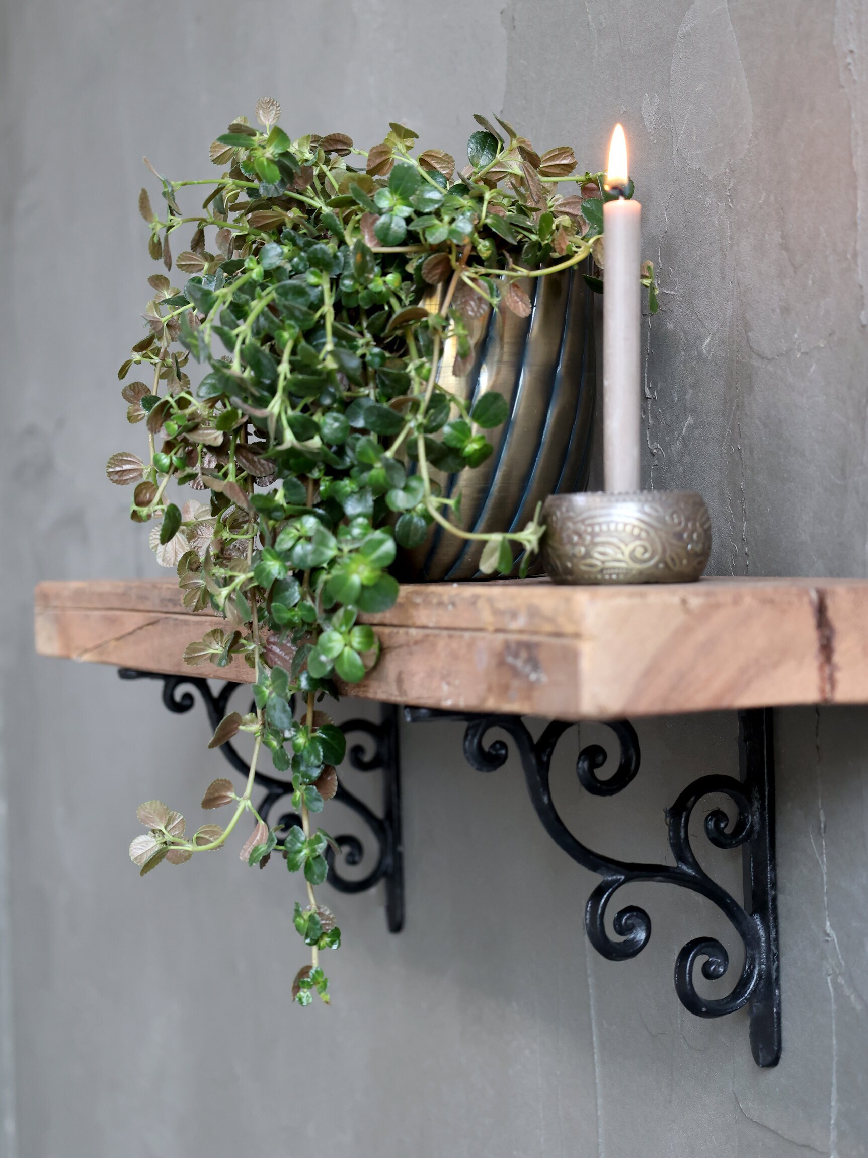 I bilden från Köpstaden.se ser vi en hyllkonsol från Chic Antique. Denna hyllkonsol i antiksvart ger en robust men elegant känsla med sina detaljerade och svängda smidesjärnsdekorationer. Konsolen är fastsatt mot en grå murvägg som har en lätt texturerad yta, vilket framhäver kontrasten i de svarta metallelementen.