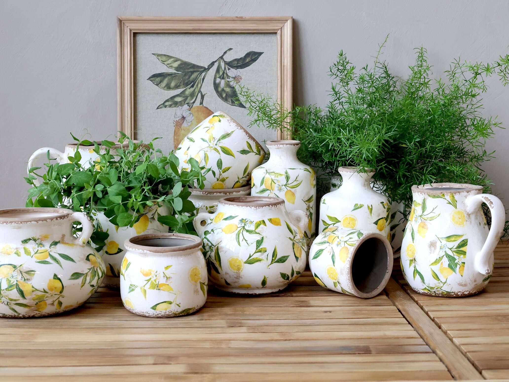 I bakgrunden kan man skymta en inramad tavla, där ett motiv av citronträd och blad speglar krukornas design. Denna detalj bidrar till en känsla av hemtrevnad och genomtänkt dekoration, vilket gör att produkterna från Köpstaden.se passar i många olika interiörer.
