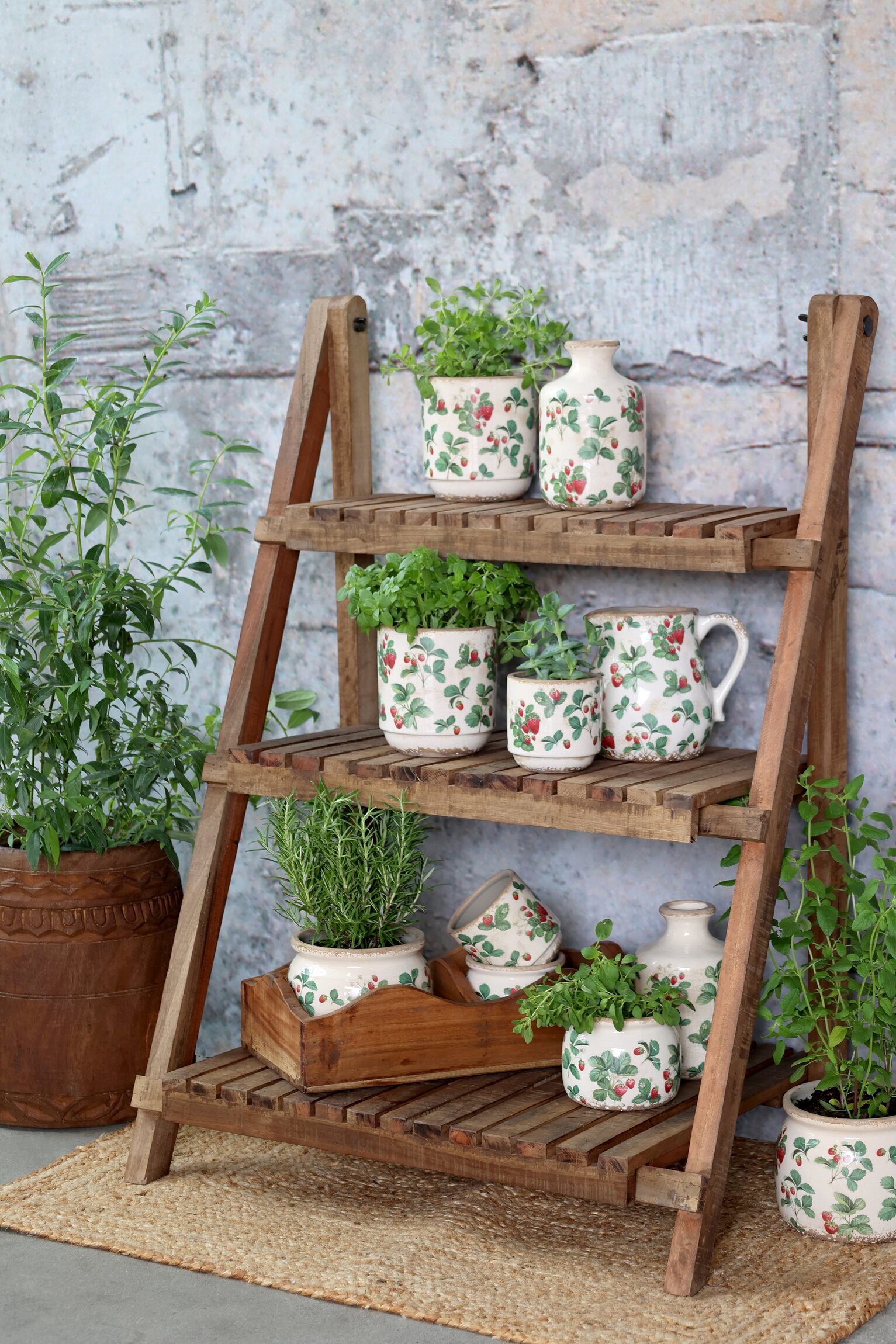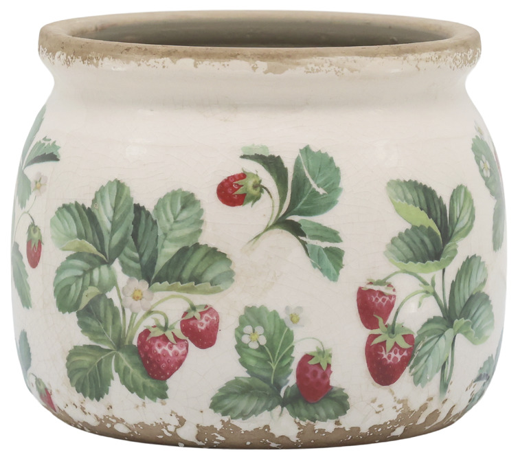 En charmig kruka i keramik med ett dekorativt jordgubbsmotiv som ger en lantlig och somrig känsla. Den passar perfekt för örter, små växter eller blommor och blir en fin detalj i både kök, uterum eller på fönsterbrädan.