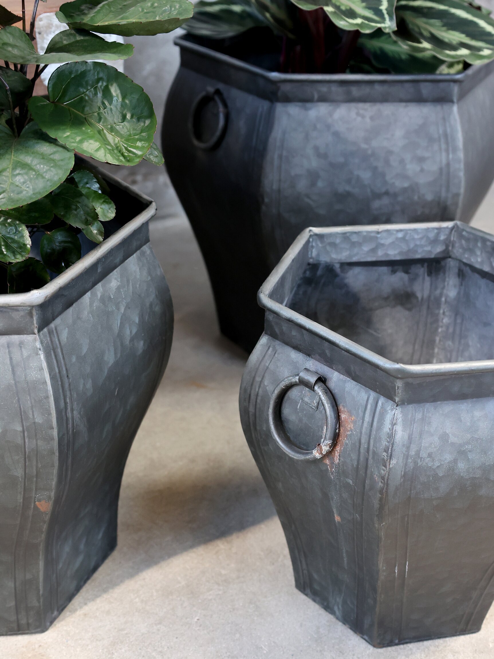Varje kruka har en sexkantig form som bryter av mot de traditionella runda eller fyrkantiga krukdesigner som ofta finns på marknaden. Denna unika form ger en modern känsla, samtidigt som ytan bär en anstrykning av vintage genom sin antikbehandlade finish. De stora, cirkulära handtagen på sidorna av krukorna är både funktionella och dekorativa, vilket gör det lätt att flytta dem samtidigt som de adderar en extra dimension till designen.