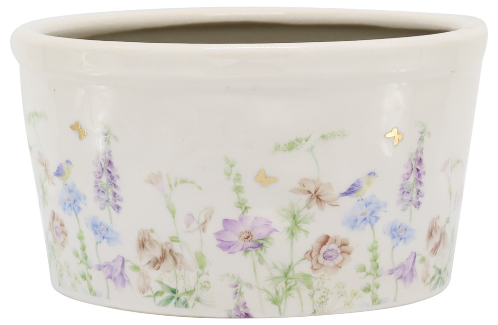 En vacker kruka i keramik med ett mjukt och romantiskt blommönster. De små blommorna i milda färger tillsammans med diskreta fjärilar ger ett lätt och somrigt uttryck som passar fint i både klassiska och lantliga miljöer.