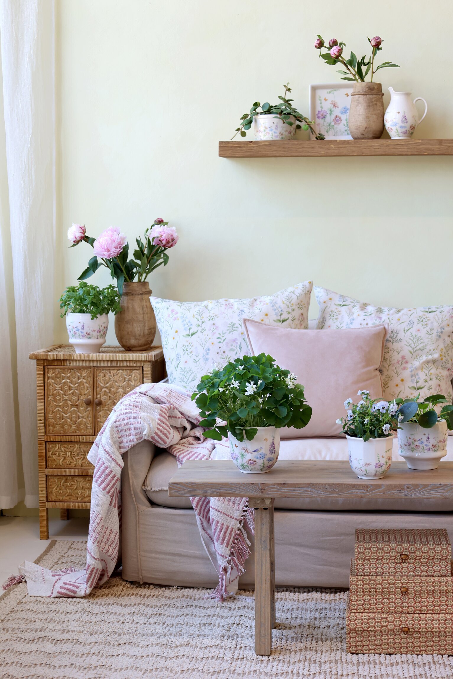 En vacker kruka i keramik med ett mjukt och romantiskt blommönster. Läs mer