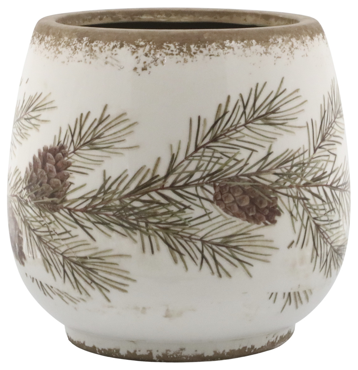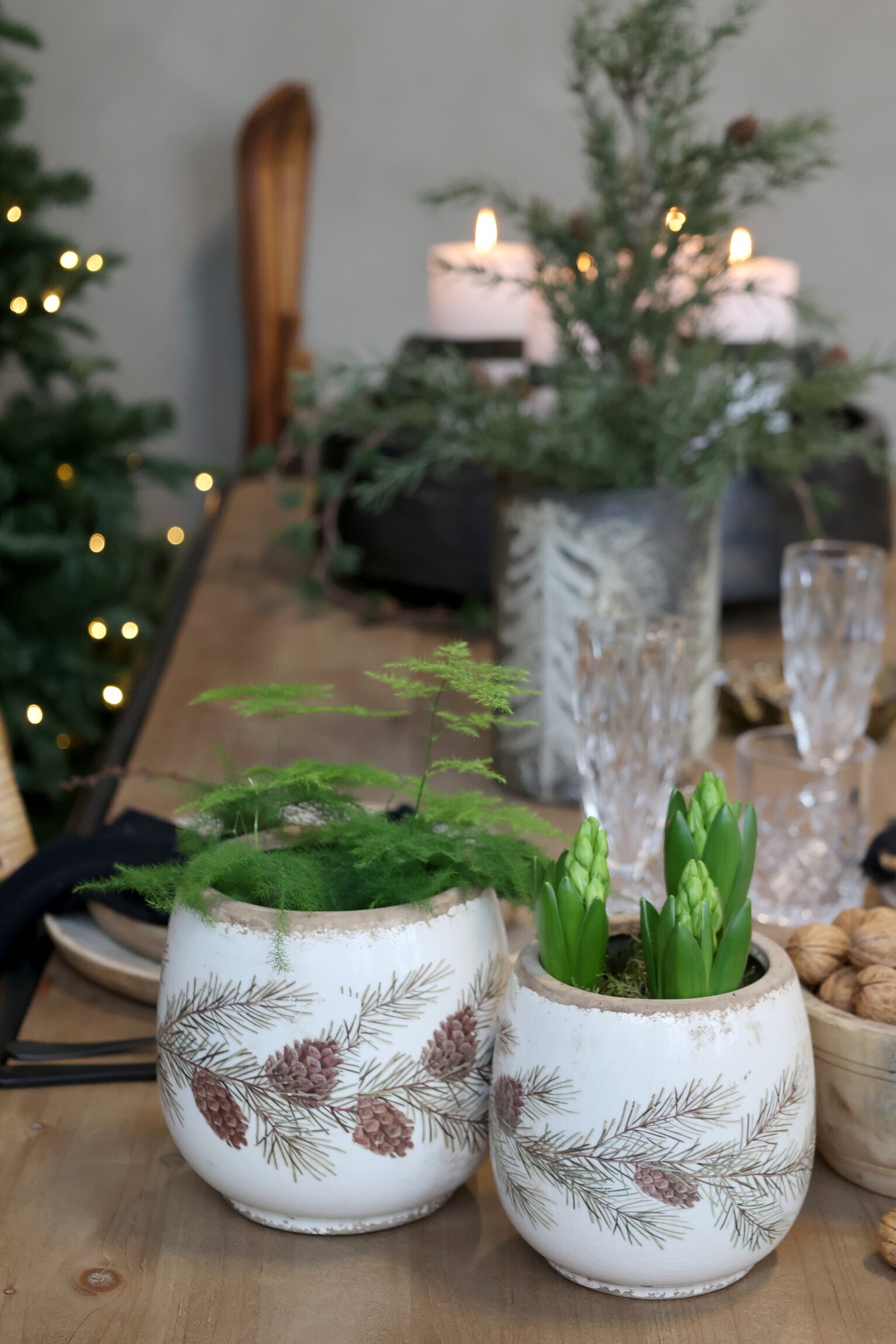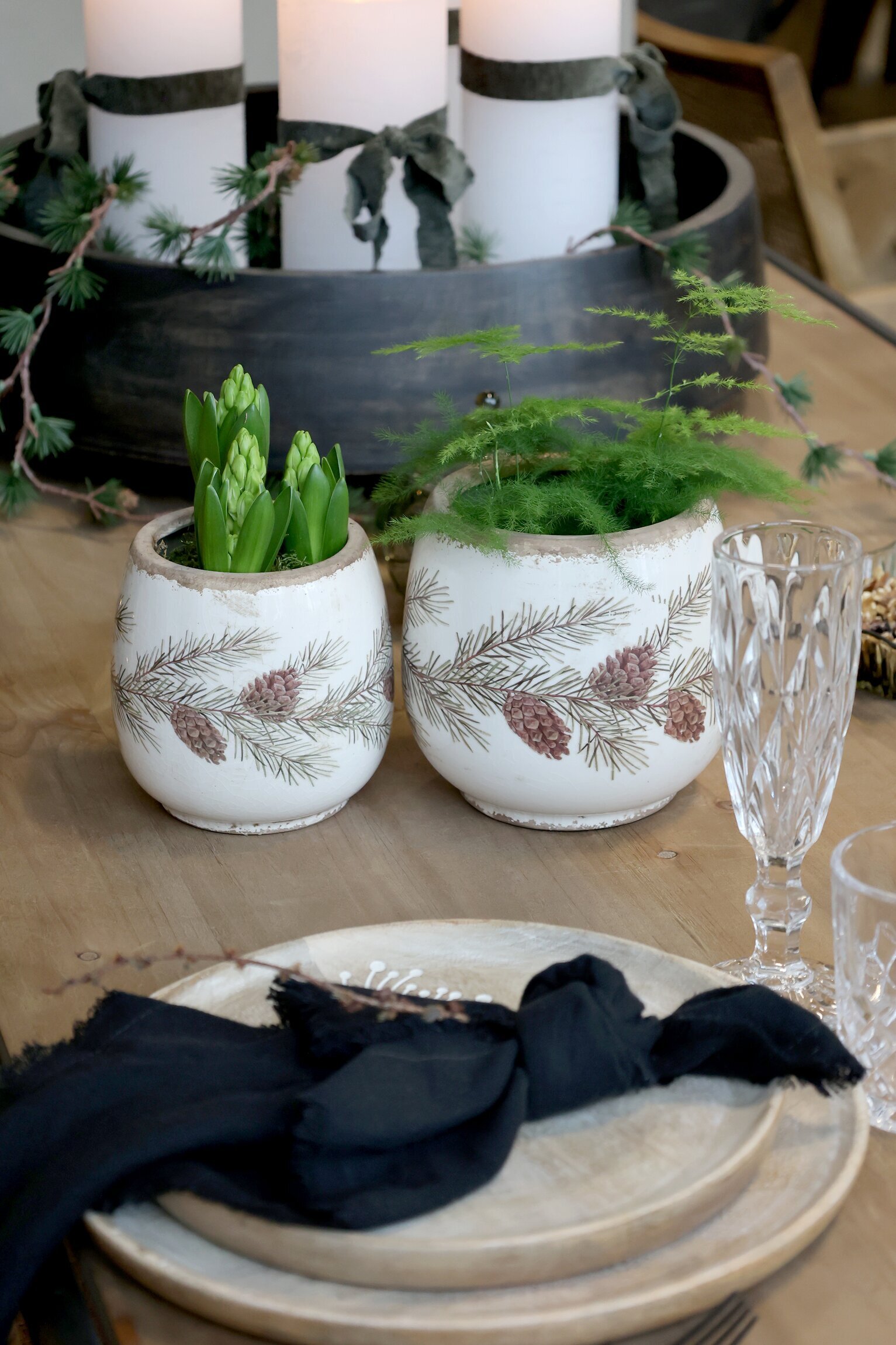 En stämningsfull keramikkruka med handmålat mönster av grankvistar och kottar – perfekt för vinterns och julens dekorationer. Den rustika glasyren och de naturtrogna detaljerna ger krukan en tidlös charm som passar lika bra i köket som i vardagsrummet. Placera en grön växt, en liten gran eller säsongens blommor i krukan och låt den bli en naturlig del av julmyset.