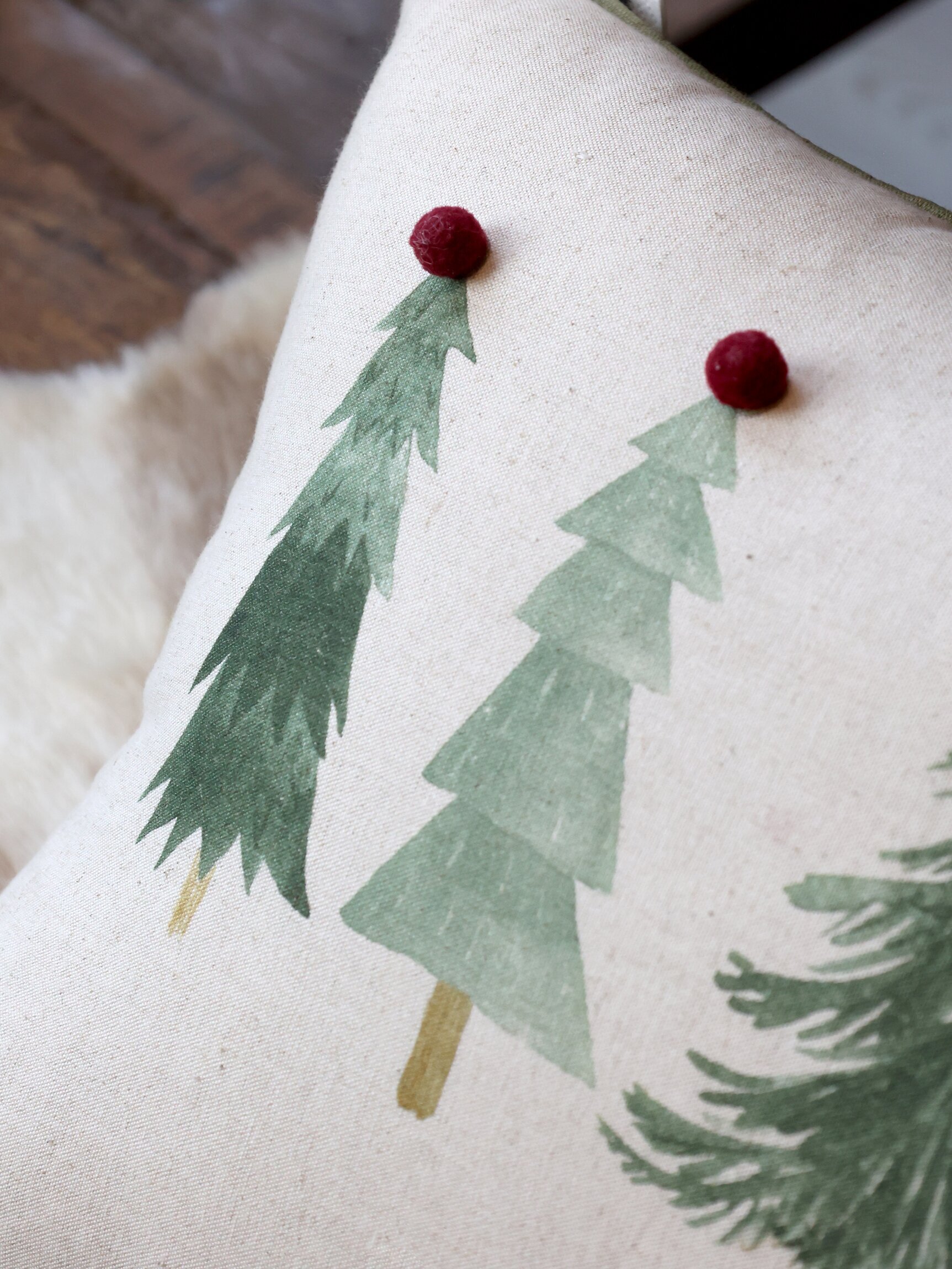 Bilden visar ett kuddfodral från Chic Antique, en produkt som finns tillgänglig hos Köpstaden.se. Kuddfodralet har ett charmigt jultema med motiv av vintergranar i olika nyanser av grönt. Granarna är enkelt målade i stiliserade former med olika lager av gröna toner, vilket skapar en subtil men festlig känsla. Det finns också dekorativa små röda bollar som placerats ovanpå två av granarna, vilket ger en fin kontrast till det gröna.