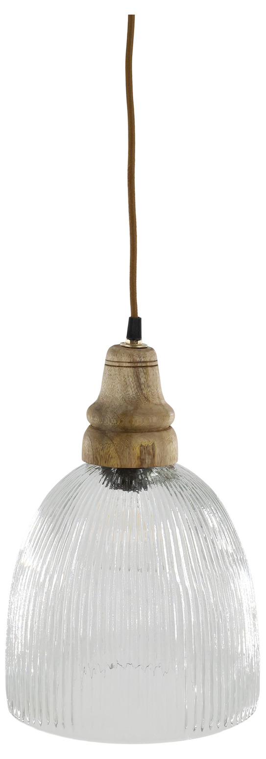 Denna vackra takpendel kombinerar klart glas med en rustik detalj i mangoträ, vilket ger en varm och naturlig känsla i inredningen. Den räfflade glaskupan sprider ljuset på ett mjukt och stämningsfullt sätt, samtidigt som trädetaljen skapar en charmig kontrast som passar både lantlig och modern stil.