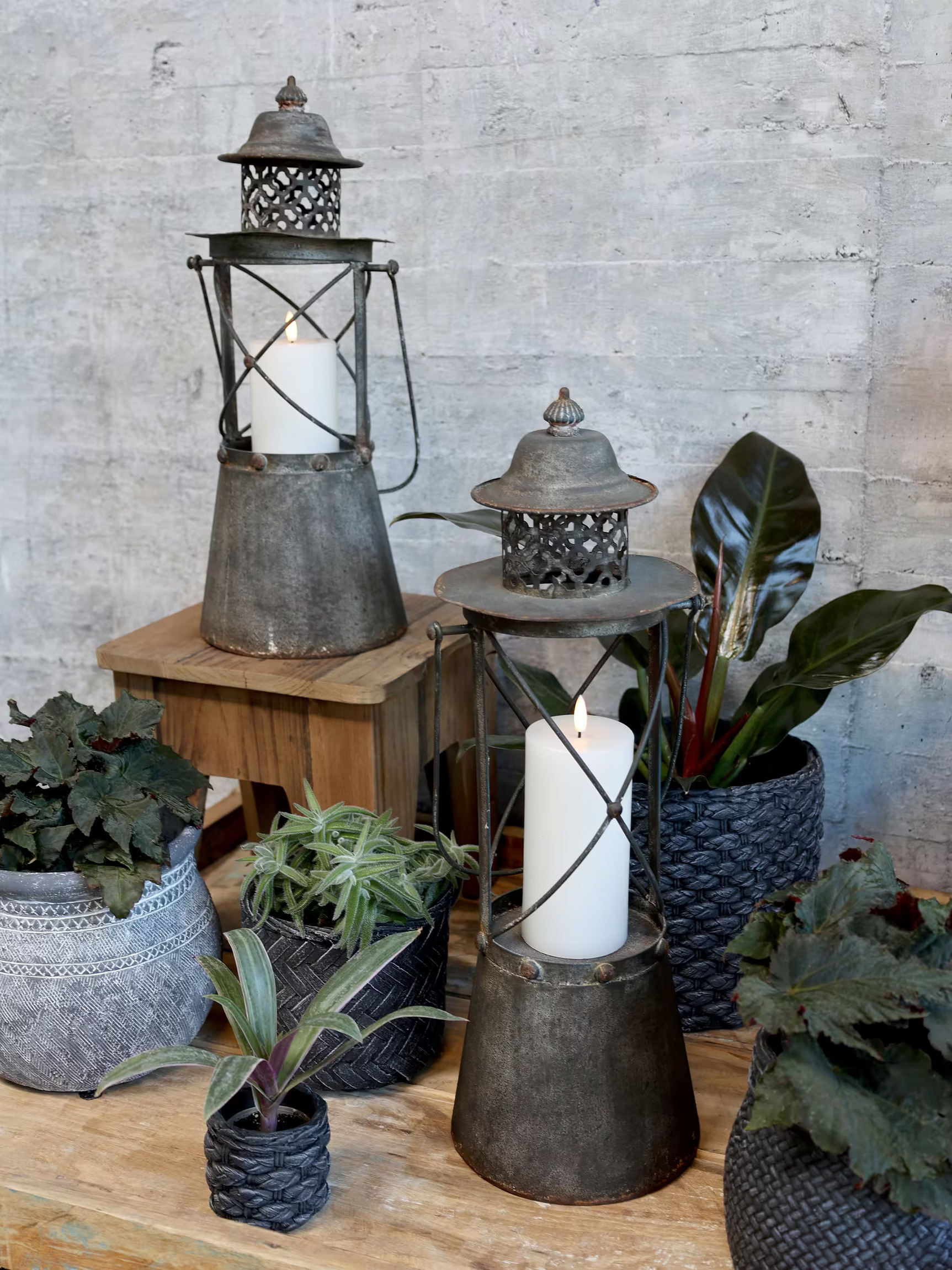Runt lanternorna finns en samling krukväxter av olika sorter. Varje växt sitter i en unik kruka med diskreta men ändå effektfulla mönster. En av de större växterna, placerad i en kruka med en dekorativ relief, visar upp mörkt gröna blad som skapar en fin kontrast till de ljusare tonerna i träet och metallen. Bredvid denna syns en medelstor planta i en flätad kruka, vars blad är långsmala och varierade i färg, vilket ger liv och dynamik till bilden.