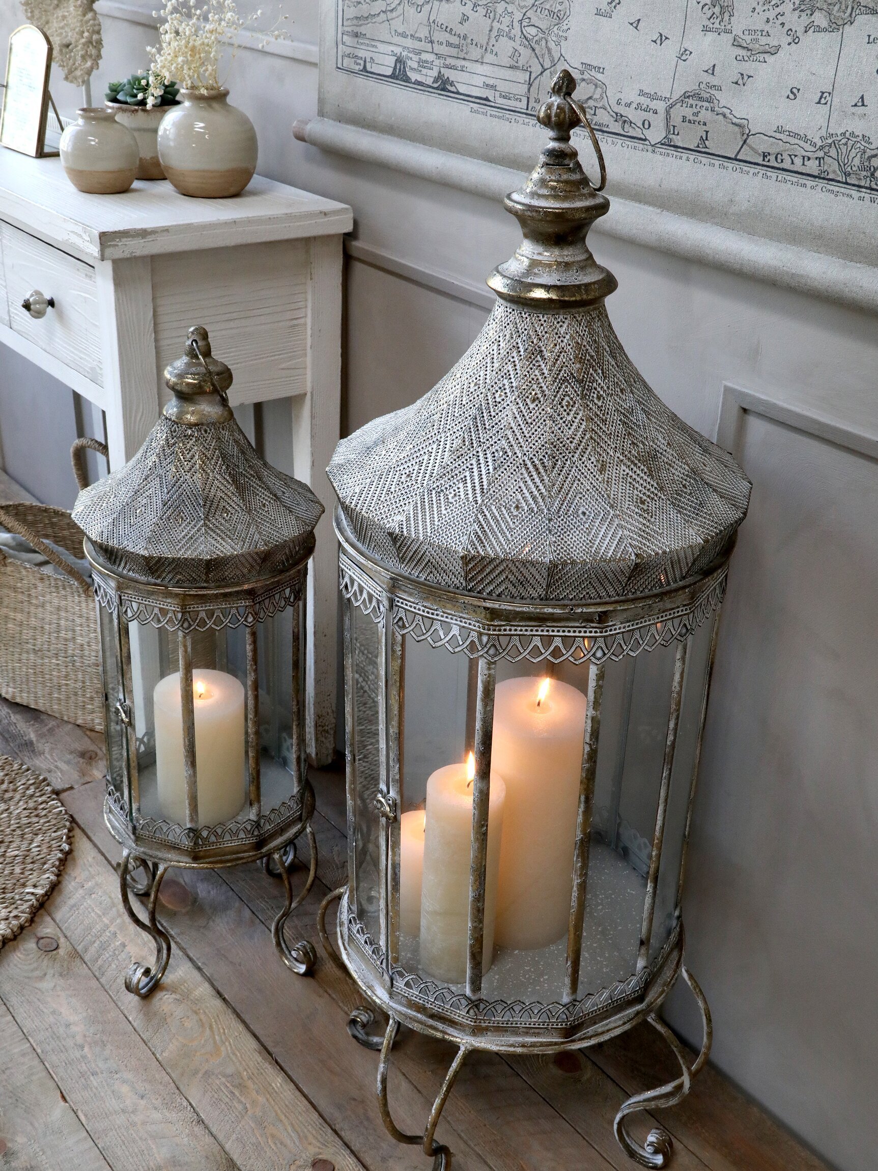 Bakom lanternorna syns en vitmålad konsolbord, vars enkla men charmiga design kompletterar inredningen väl. På bordet finns ett par keramikvaser i jordnära toner, fyllda med torkade blommor och en liten grön växt, vilka adderar en naturlig och levande touch till miljön. Den lågmälda färgpaletten med naturinspirerade inslag gör att lanternorna framträder som en central del av inredningen.