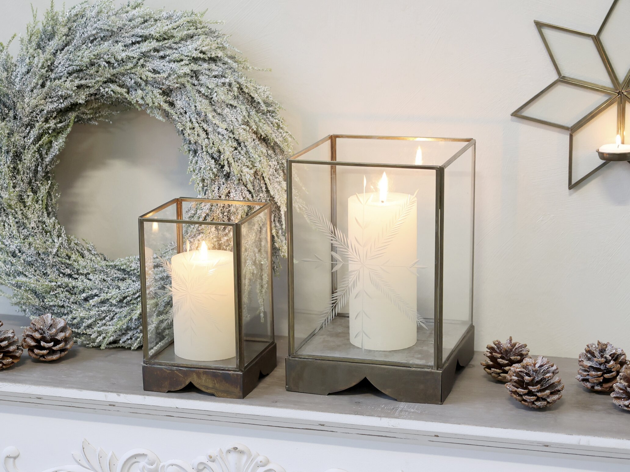 Den ena lyktan är något större än den andra, vilket ger en fin asymmetri och dynamik till arrangemanget. Inuti vardera lykta brinner ett vitt blockljus, vars låga skapar ett varmt och mjukt sken. Ljuset reflekteras mot glasets insida och förstärker snöflingmönstret, vilket ger en stämningsfull ljuseffekt i rummet.