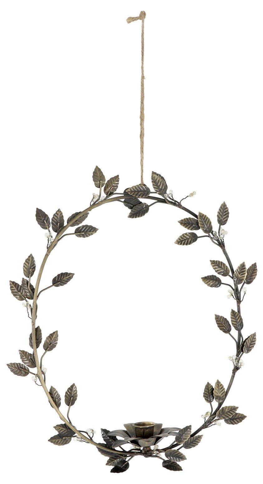 Hängande krans med vackra bladdekorationer i antik mässing. Ljusstaken kan användas tillsammans med lite kortare kronljus, exempelvis våra korta stearinljus.