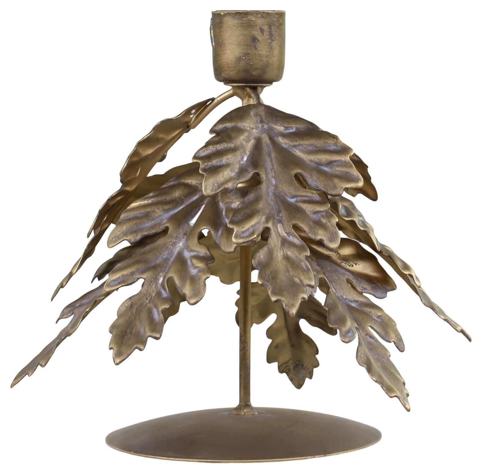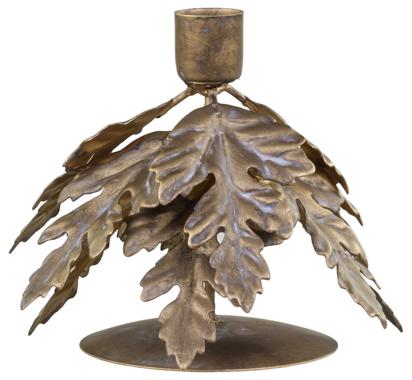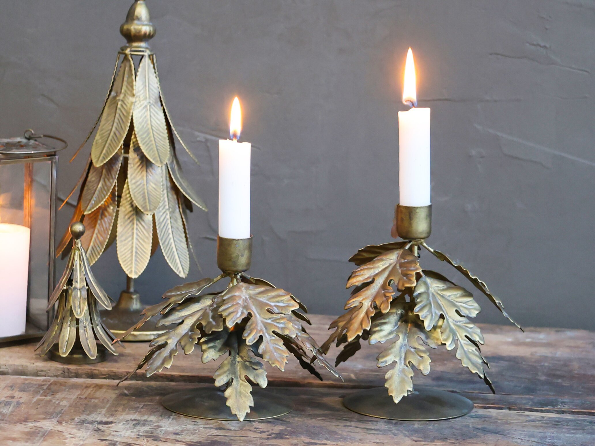 Vacker ljusstake med blad i antik mässing, från Chic Antique.