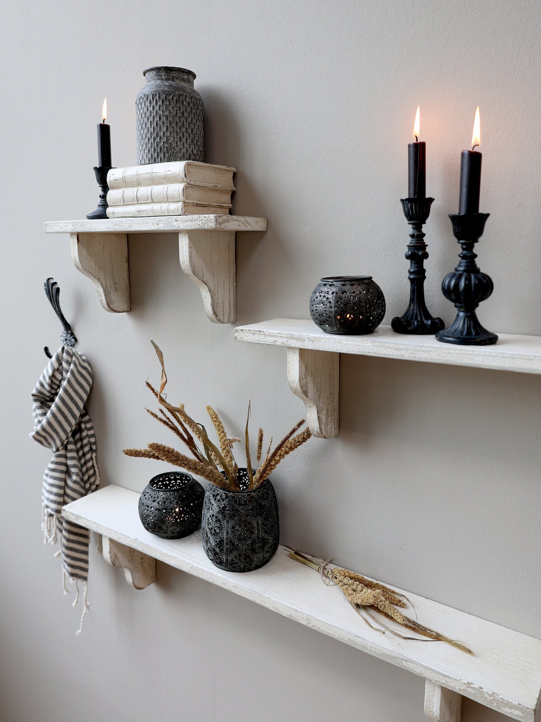 Den mittersta hyllan rymmer två svarta ljusstakar, något mer utsmyckade i designen, och ytterligare ett tänt ljus som samspelar med den höstliga stämningen. Bredvid ljusstakarna finns en svart, filigranmönstrad ljuslykta som på ett distinkt sätt fångar och sprider det varma ljuset.