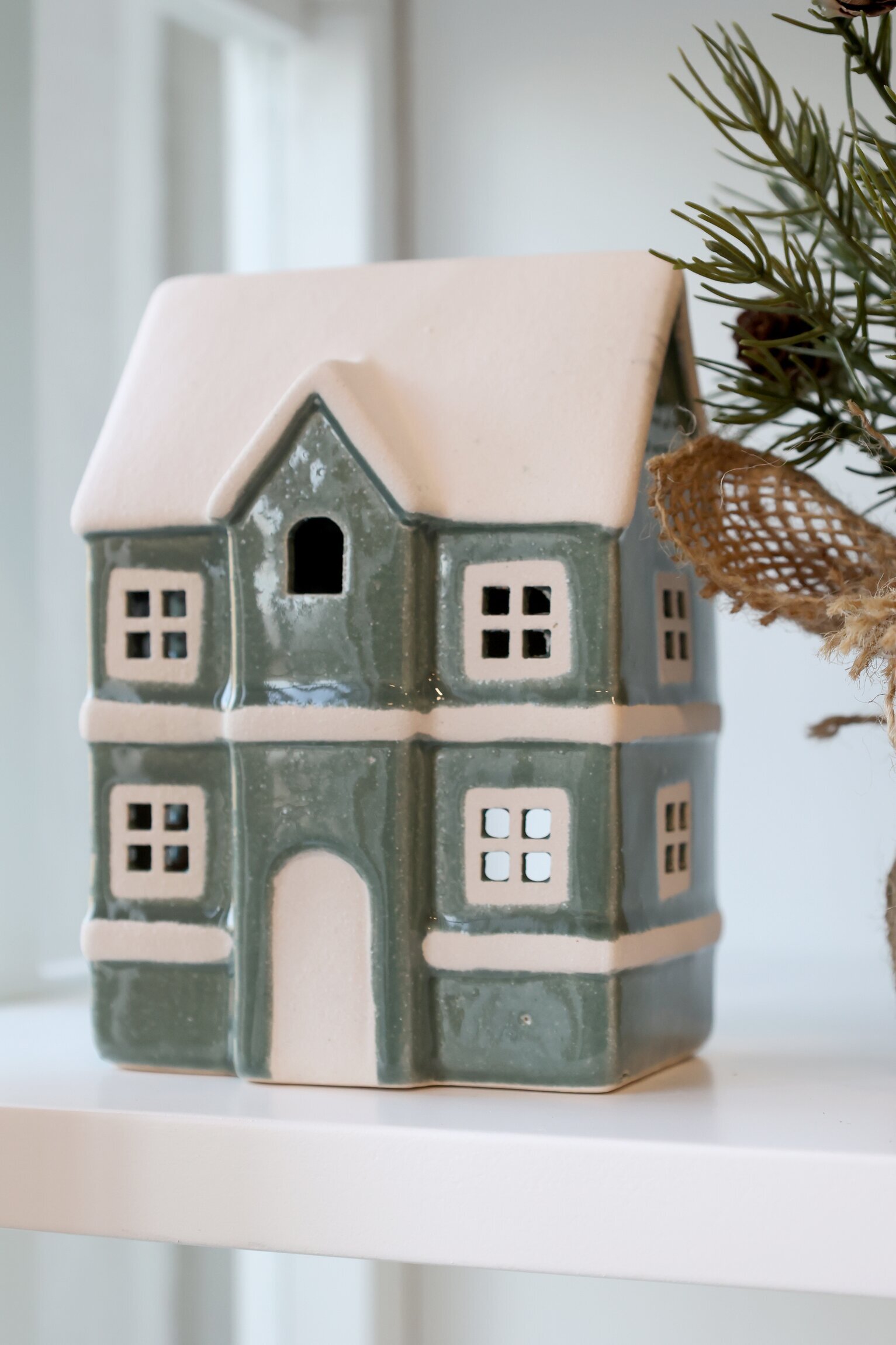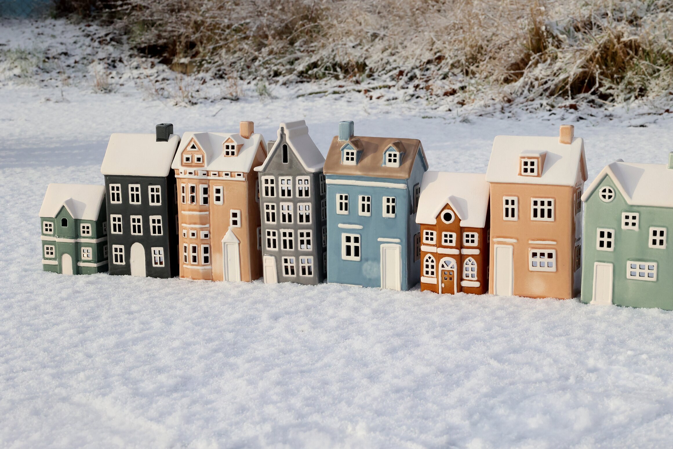 Skapa en mysig och stämningsfull känsla hemma med denna charmiga ljuslykta i form av ett litet hus. Med sin mjuka färg och snötäckta tak sprider den ett varmt sken när du placerar ett värmeljus inuti.