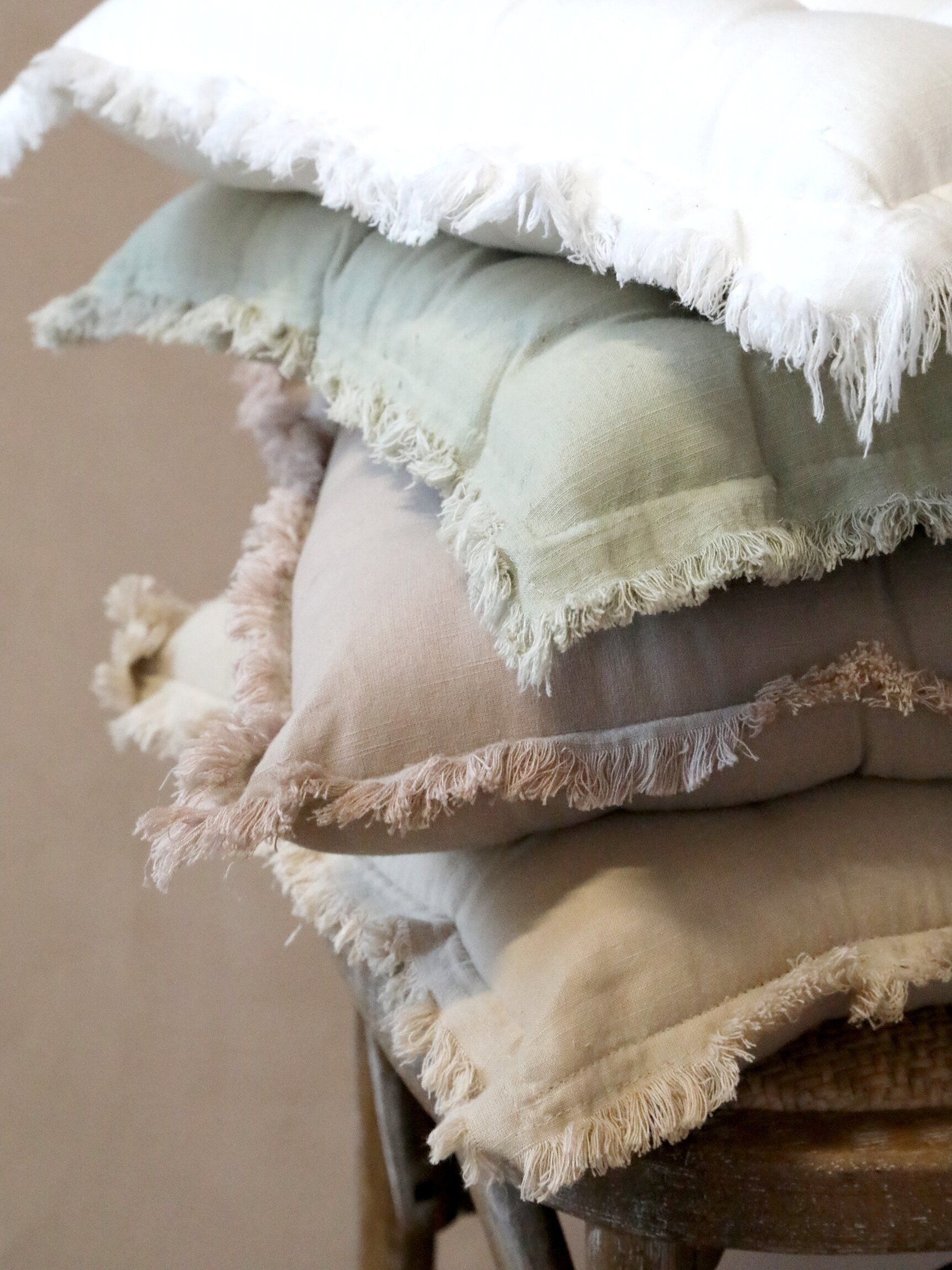 Mjuk stolsdyna med fransar samt knytbara band, finns i flera olika färger. Från Chic Antique.