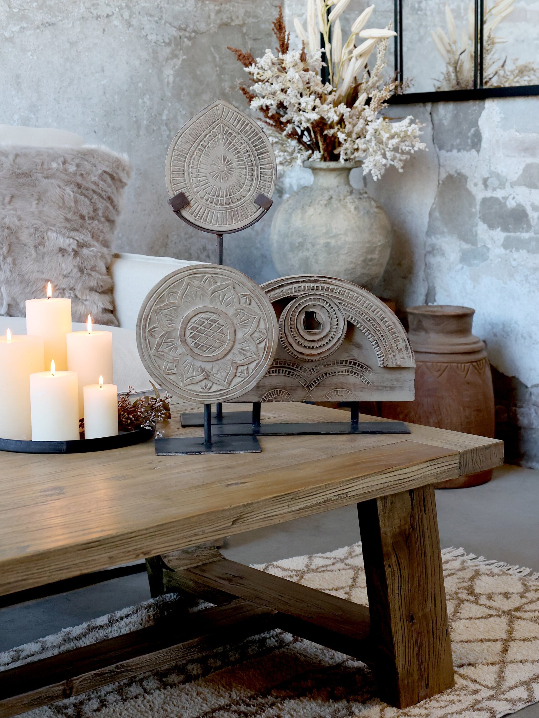 Bilden visar en stilfull inredningsmiljö som harmoniserar med Köpstaden.se:s breda utbud för hemmet. I fokus står ett rustikt soffbord i massivt trä, vars naturliga ådringar framhäver en varm och inbjudande känsla. På bordets yta vilar en dekorativ samling av snidade stenskivor uppställda på metallstativ. Dessa skulpturer har detaljerade mönster och intrikata sniderier som för tankarna till traditionellt hantverk.