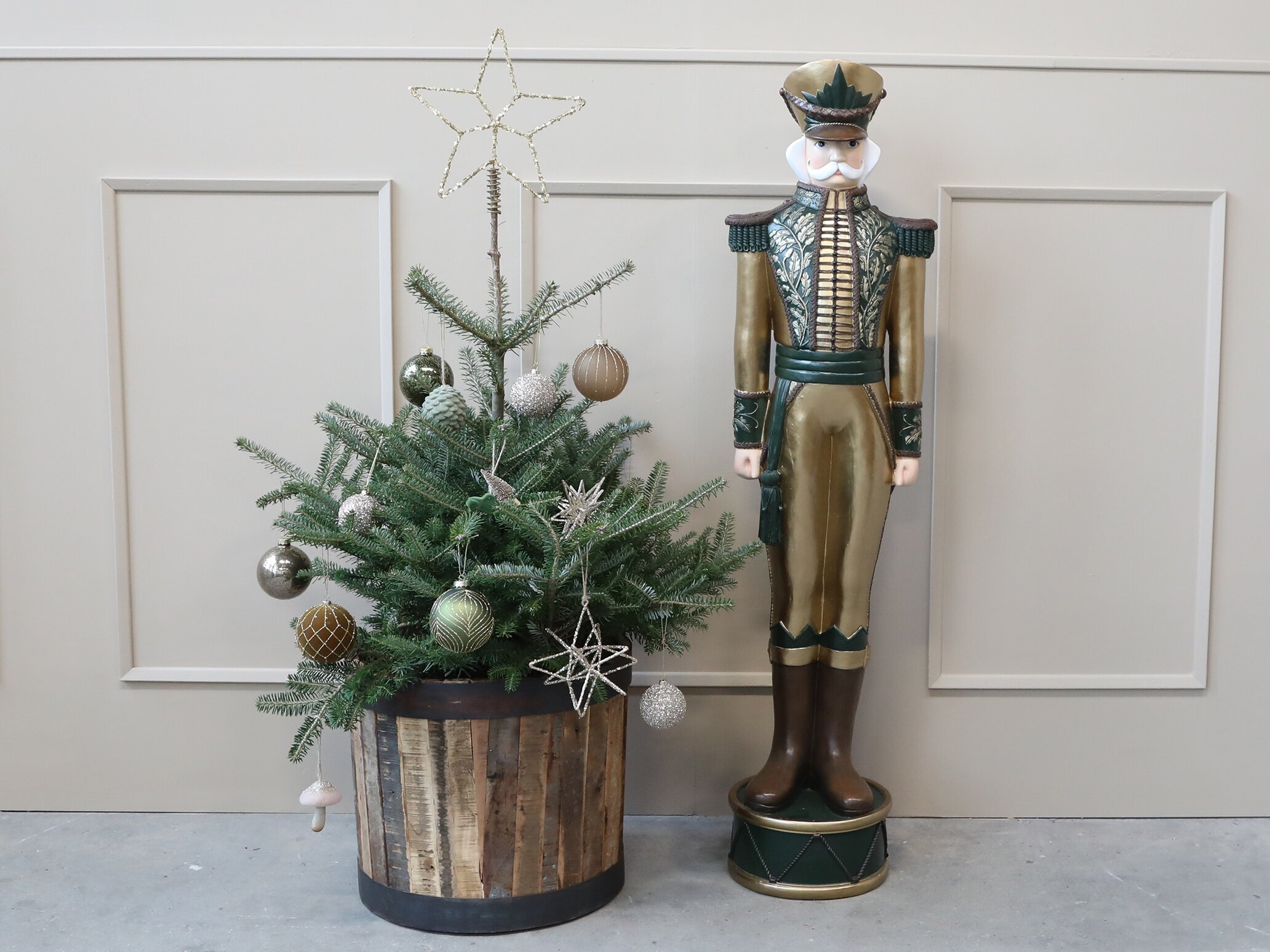 Bredvid nötknäpparen står en mindre julgran planterad i en rustik kruka av trä. Krukan har ett varierat träslag med olika nyanser, vilket bidrar till en autentisk och jordnära känsla. Grenarna på granen är prydda med ett flertal julkulor i olika storlekar och mönster, allt från glittrande silver till djupare, mer jordnära toner. Den översta delen av granen är krönt med en stjärna gjord av spolar eller en annan metallisk tråd, kompletterande dekoren med sin enkla men tilltalande form.