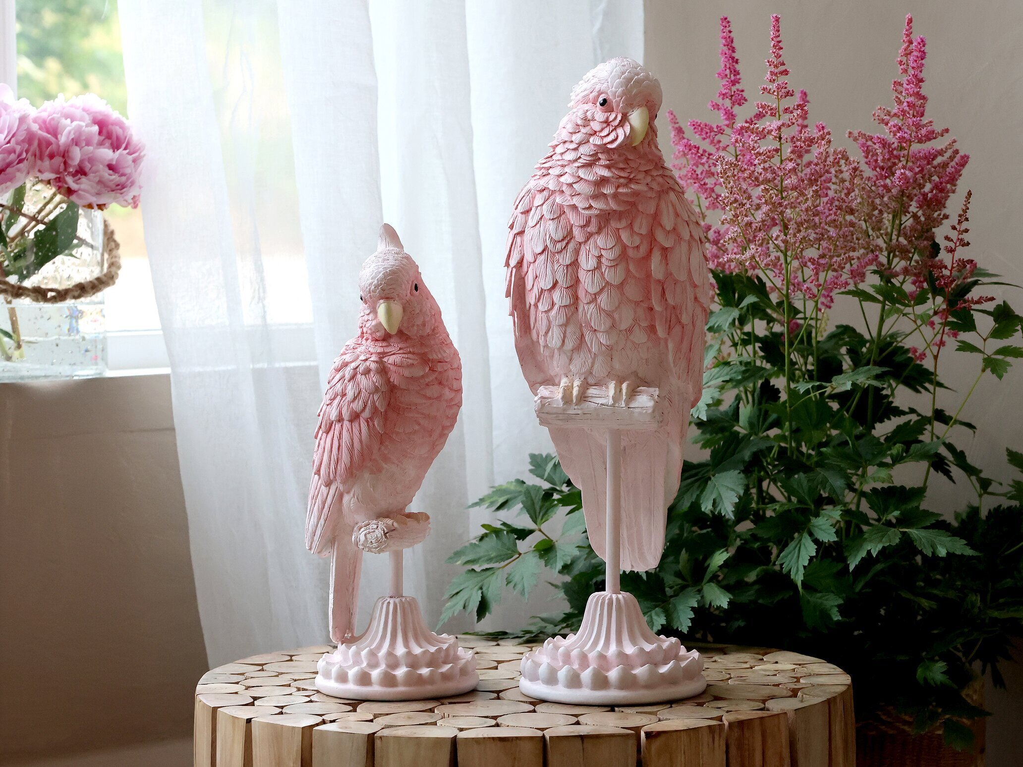 Vacker rosa papegoja på vit/rosa stativ, finns i 2 olika storlekar. Från Chic Antique.
