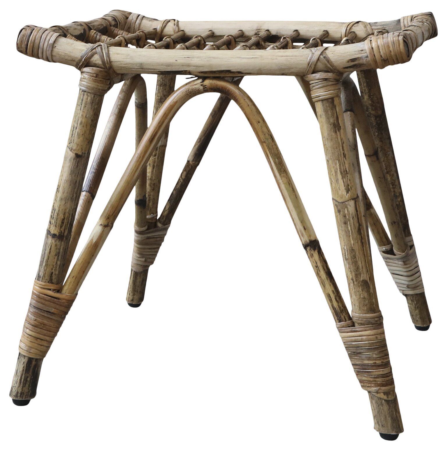 Stommen har en naturlig träfinish med nyanser av brunt och beige som ger pallen ett levande och organiskt uttryck. Varje ben är noggrant bundet med rottingband, vilket inte bara förstärker stabiliteten utan också bidrar med estetiska inslag. Benens spetsar är försedda med små svarta gummifötter som skyddar golvet från repor och ger extra grepp.
