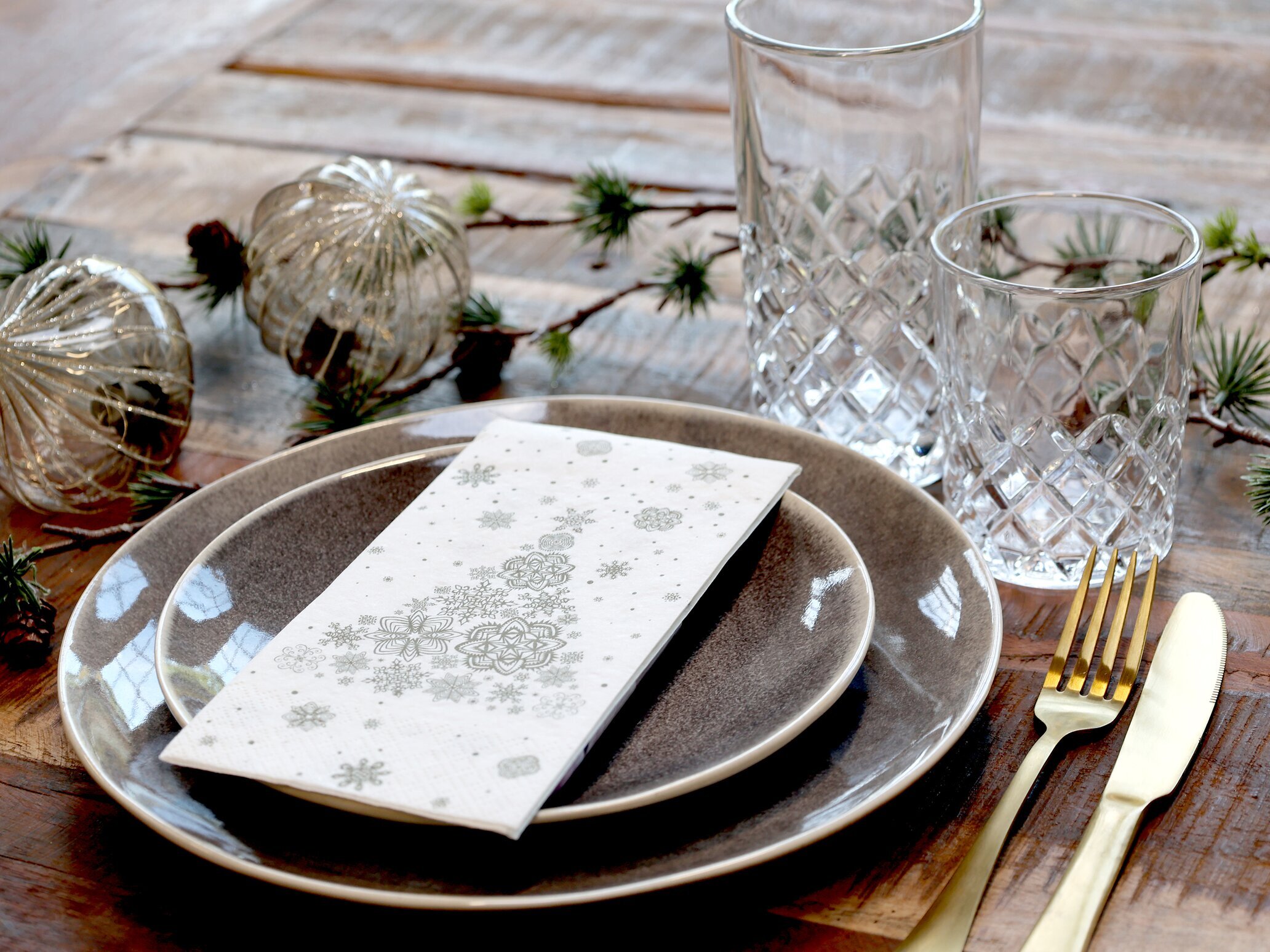 Servetterna för "Servetter Julgran" är lagda ovanpå en mörkgrå tallrik, placerad i sin tur på en större matchande tallrik. Kontrasten mellan servettens ljusa nyans och tallrikarnas djupa färg skapar en visuell balans som drar ögat direkt till mitten av uppsättningen. På servetterna ser man invecklade designmönster av snöflingor och stjärnor, vilket förstärker julkänslan.