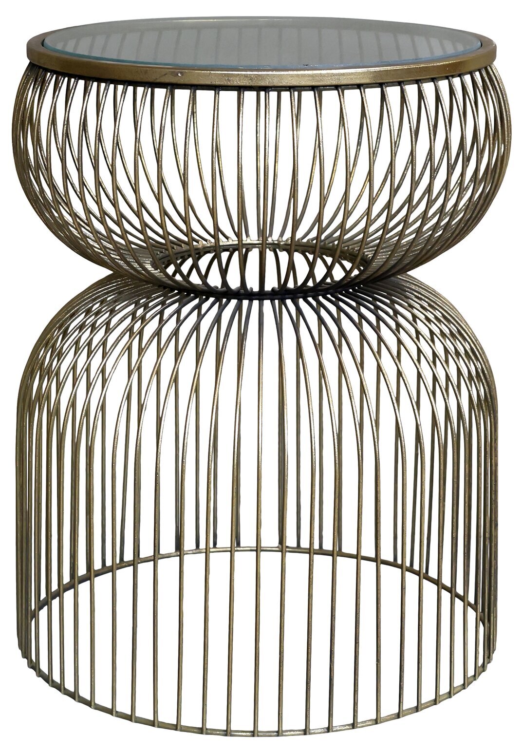Bilden föreställer ett bord från Köpstaden.se som är både attraktivt och praktiskt. Det avlastningsbord som syns i bilden är tillverkat av Chic Antique och är designat med en rund form och mäter 51 cm på höjden med en diameter på 40 cm. Dess unika struktur är konstruerad med tunna mässingsstänger som böjs i en elegant korgform, vilket ger en luftig känsla och skapar ett komplett visuellt intryck.