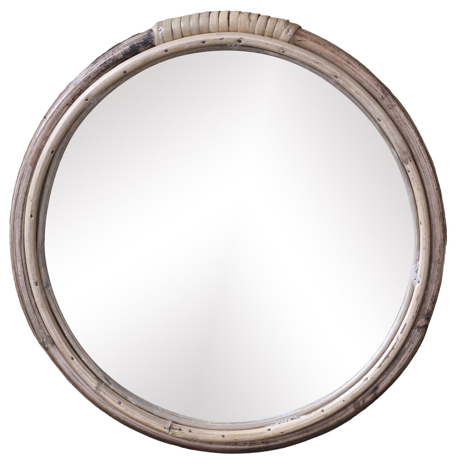 Bilden visar en rund spegel från Chic Antique med en vackert konstruerad ram av bambu, som finns tillgänglig på Köpstaden.se. Spegeln, som är en del av ett noggrant utvalt sortiment, erbjuder både funktionalitet och en stilren design för att komplettera inredningen i vilket rum som helst.