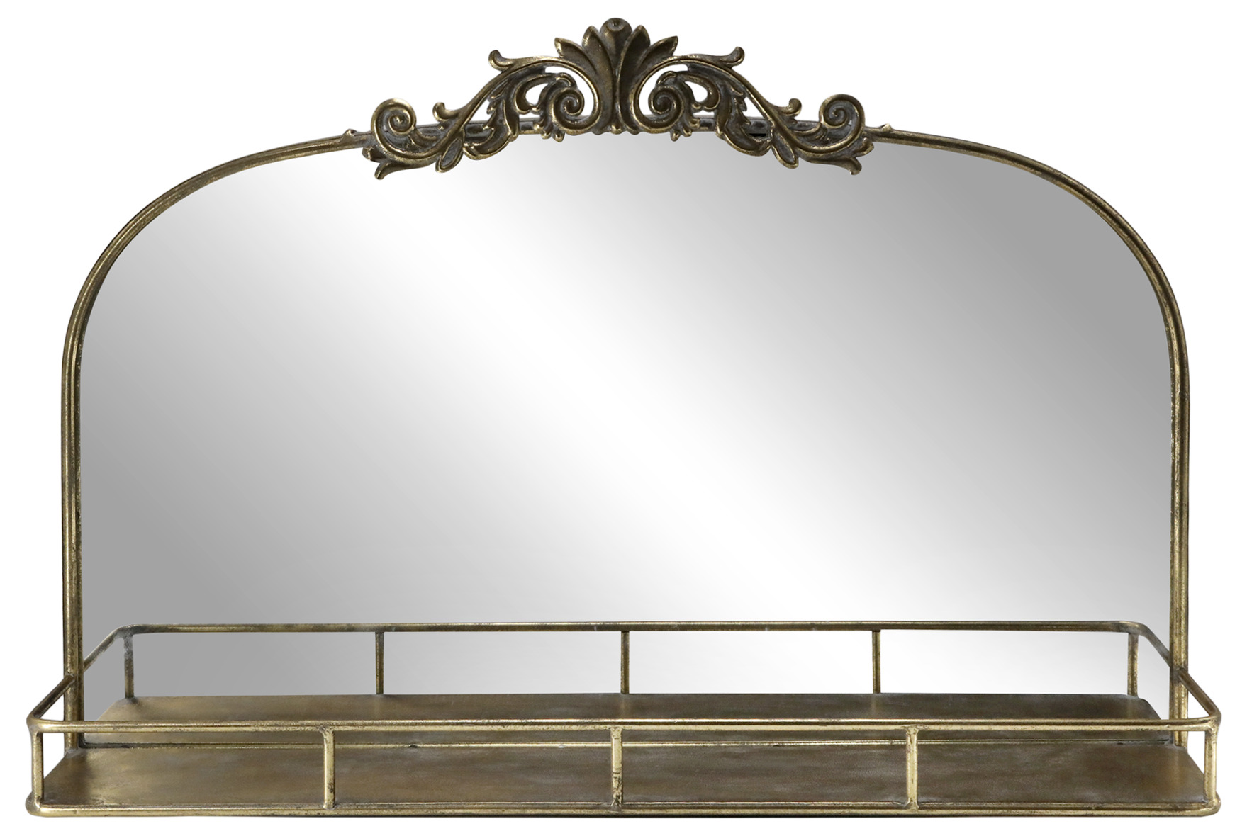 Den här vackra spegeln kombinerar klassisk charm med smart funktion. Med sin mjukt rundade form, vackra ornament i toppen och en antik finish blir den ett elegant blickfång i hallen, sovrummet eller vardagsrummet. Den integrerade hyllan ger plats för små dekorationer, doftljus eller dina favoritsaker – perfekt för att addera både stil och funktion på väggen.