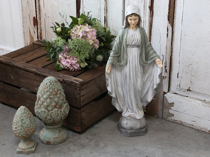 I bilden från Köpstaden.se ser vi en smakfull komposition som inkluderar statyn Madonna från varumärket Chic Antique, vilket ger en touch av klassisk elegans till vilken miljö som helst. Statyn framstår i en rofylld gestaltning, med huvudet lätt nedböjt och ögonen slutna i en stämning av meditation. Den är gjord i ett material som efterliknar antik marmor, med en subtil patina som ger ett tidslöst intryck.