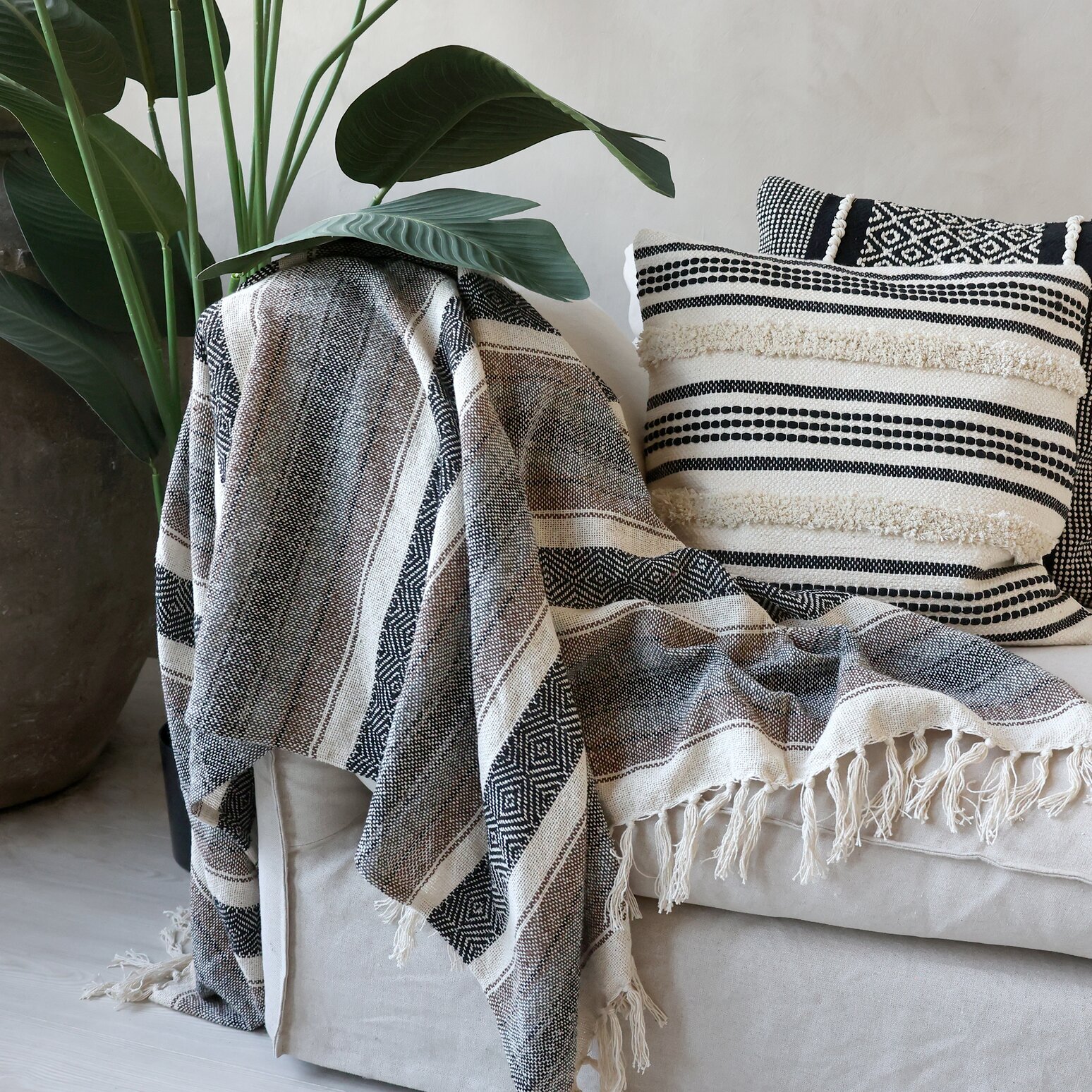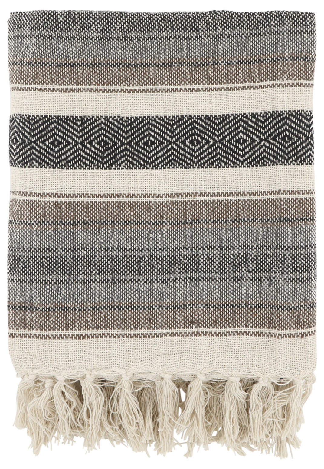 Mys till det i ditt hem med denna vackra, vävda pläd som kombinerar traditionell hantverkskvalitet med moderna mönster. Med sina jordnära färger och detaljerade mönster blir denna pläd en stilfull accent i vilket rum som helst.