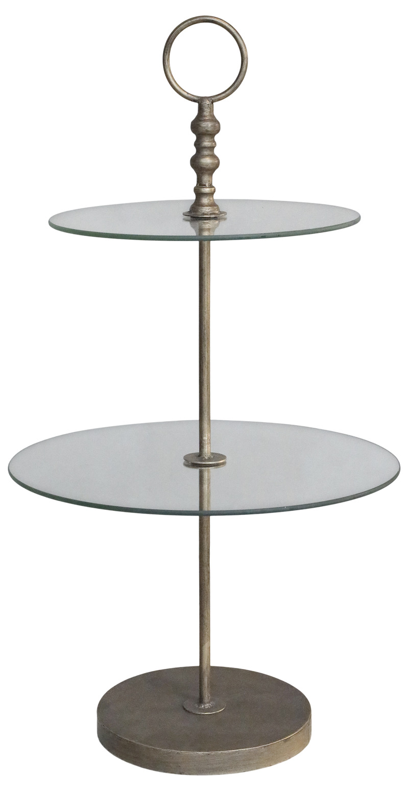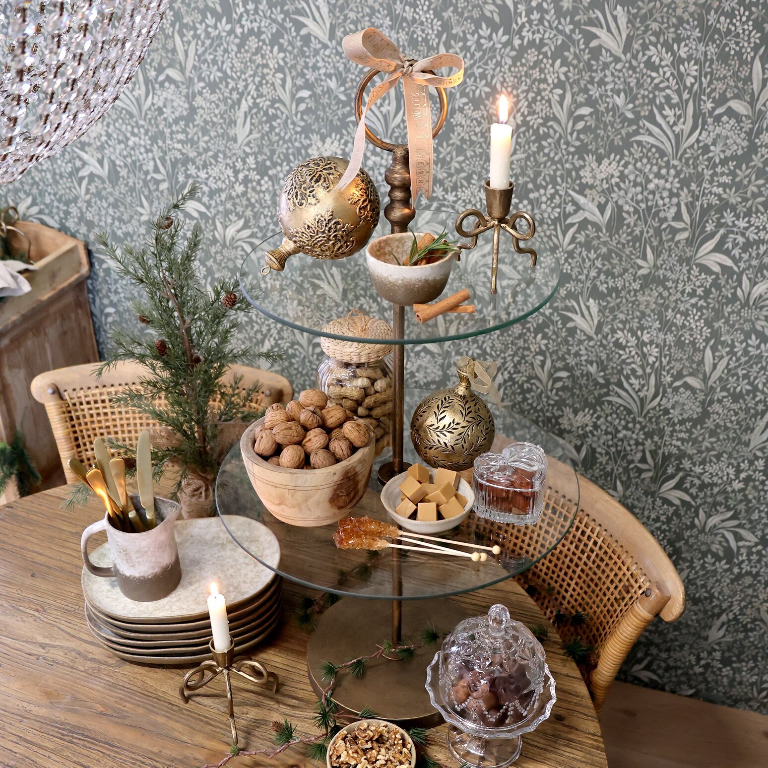 Elegant etagere i metall med två runda glasfat. Perfekt för att servera kakor, frukt, ostar eller julgodis på ett stilfullt sätt. Den tidlösa designen gör den lika vacker på festbordet som till vardags.