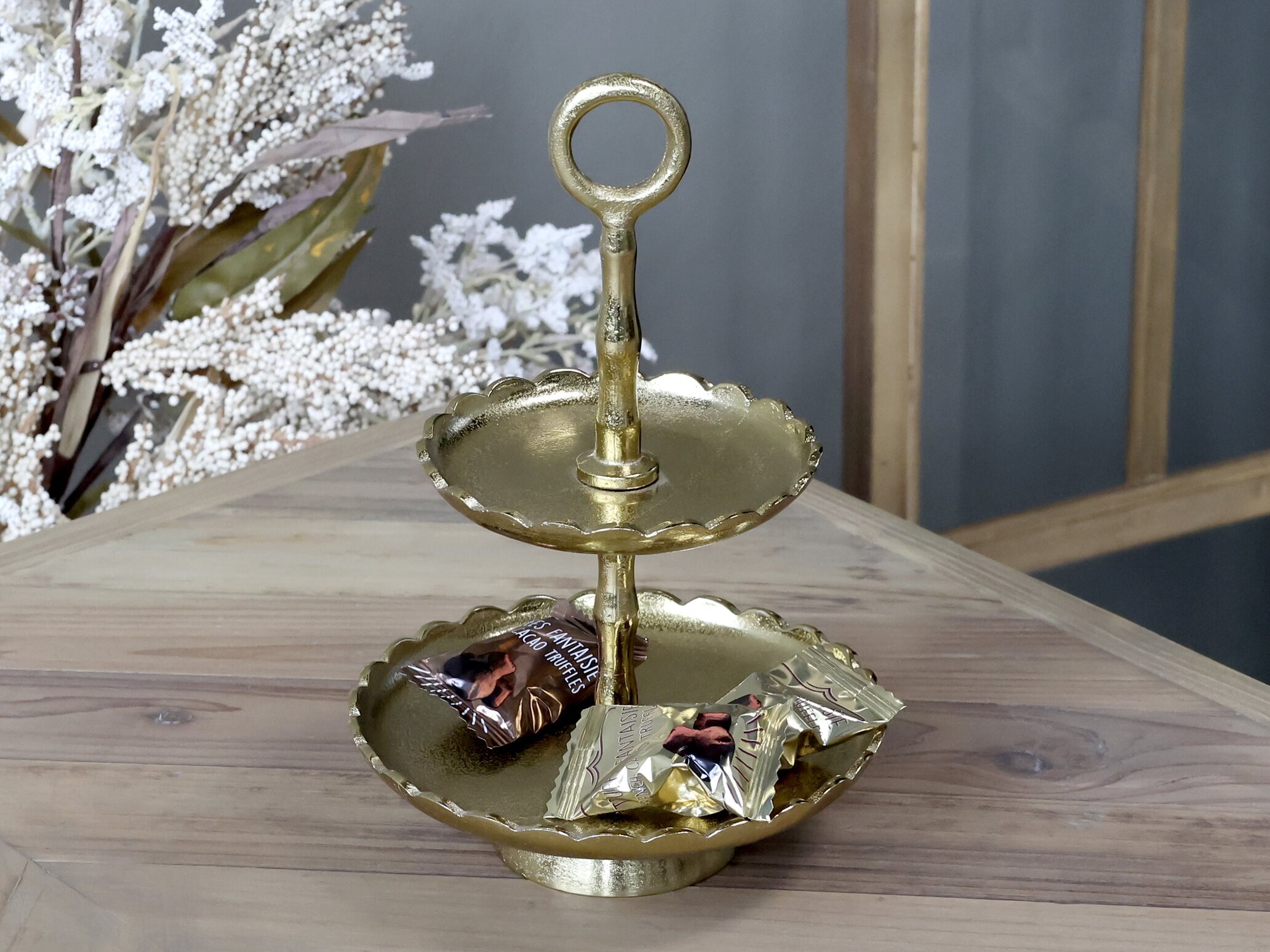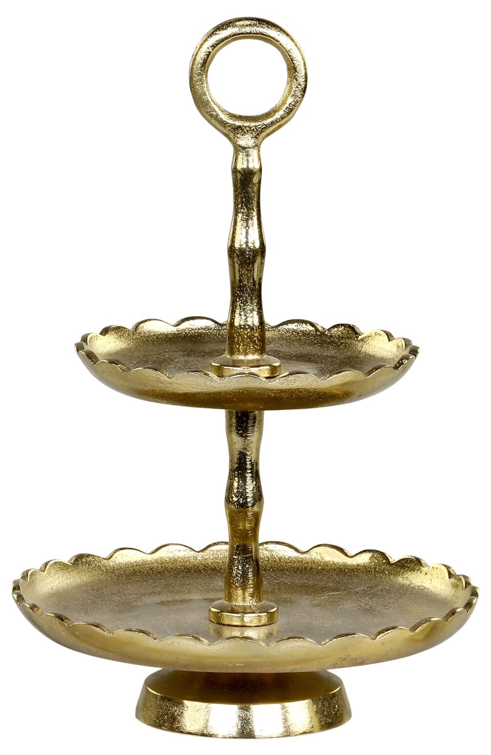 Kakfat med två våningar i mässingsfärgad aluminium, fin att använda även som fruktfat.
