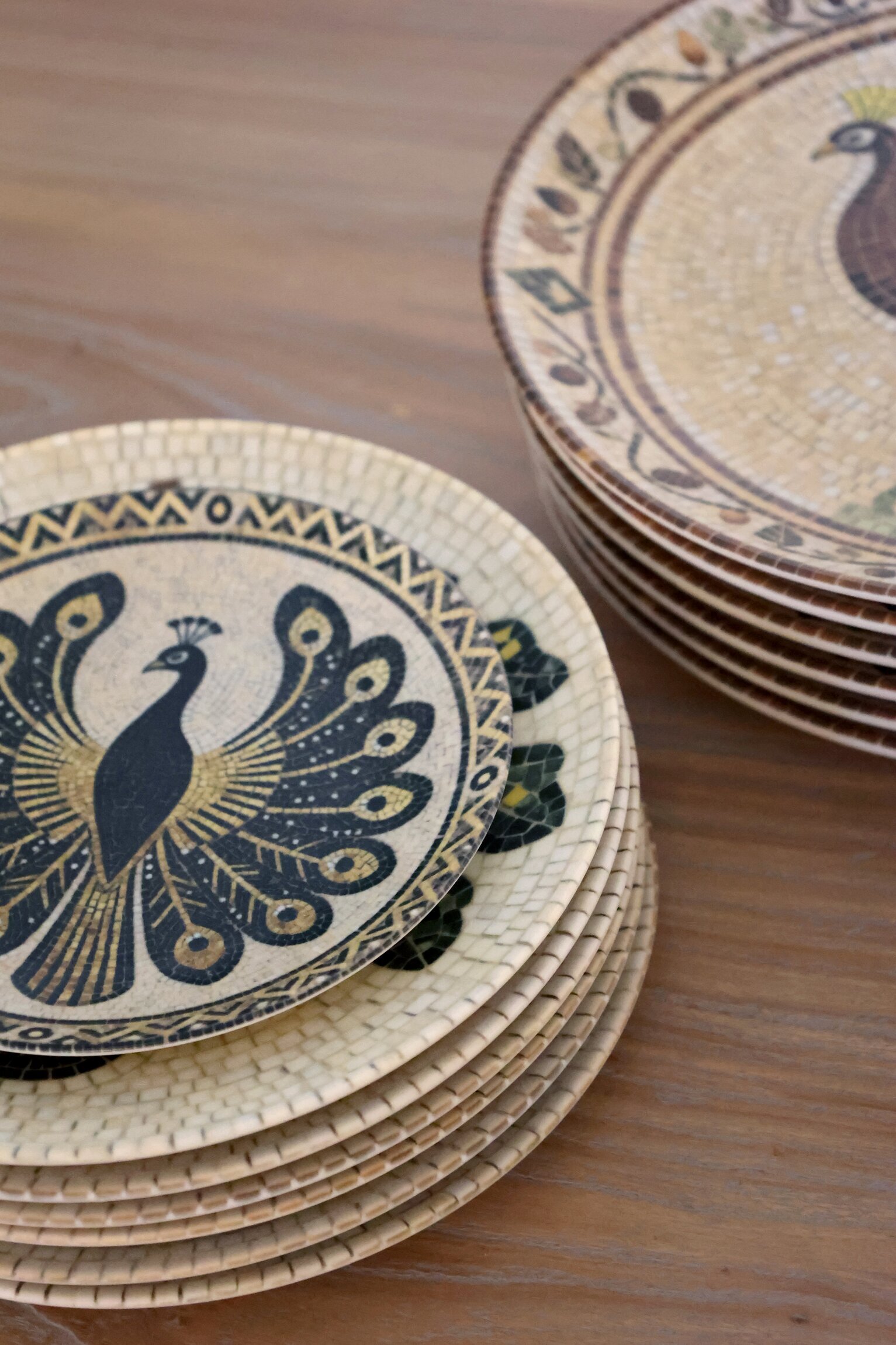 En vacker assiett i stengods med ett dekorativt mosaikmönster som ger en livfull och personlig känsla till dukningen. Den släta ytan gör den både praktisk och behaglig att använda, samtidigt som mönstret skapar ett fint blickfång på bordet.