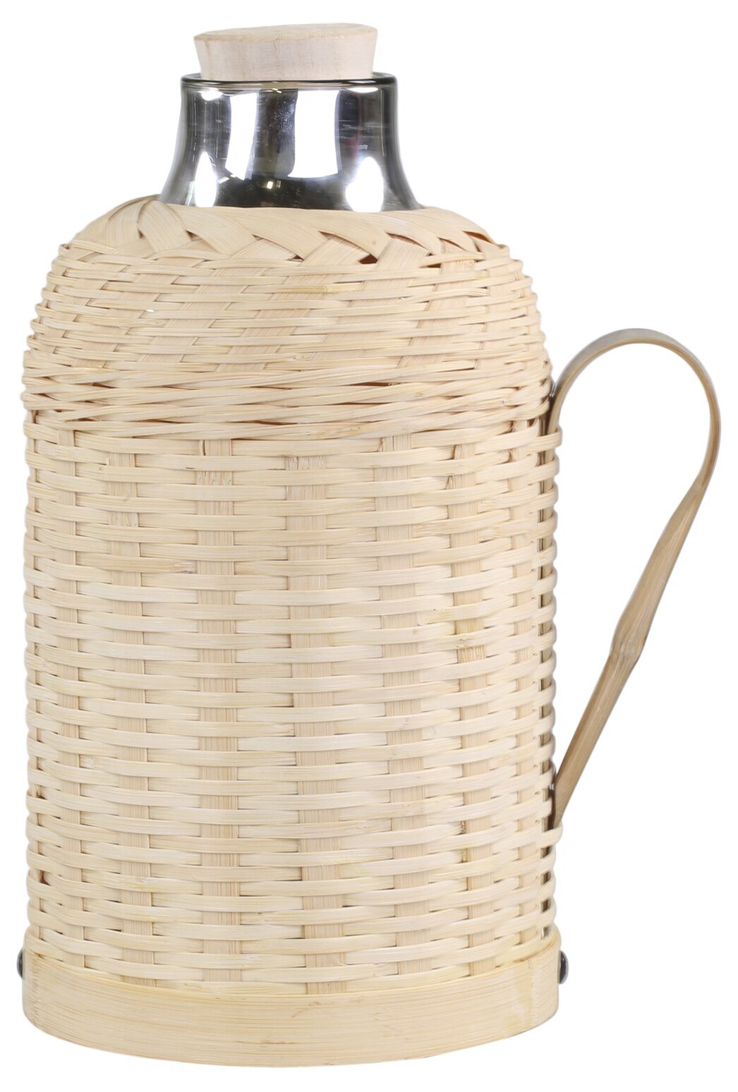 Bilden från Köpstaden.se visar en termos vid namn "Termos Flätad Bambu Natur" som tillhör varumärket Chic Antique. Termosen är konstfullt klädd i ett omsorgsfullt flätat skydd av ljus bambu, vilket ger den ett naturligt och funktionellt yttre. Det flätade mönstret består av tunna bamburemsor som är skickligt vävda tillsammans, vilket skapar en texturerad och intressant yta. Den täcker större delen av termosen, vilket gör att produkten smälter väl in i ett rustikt eller naturinspirerat hem.