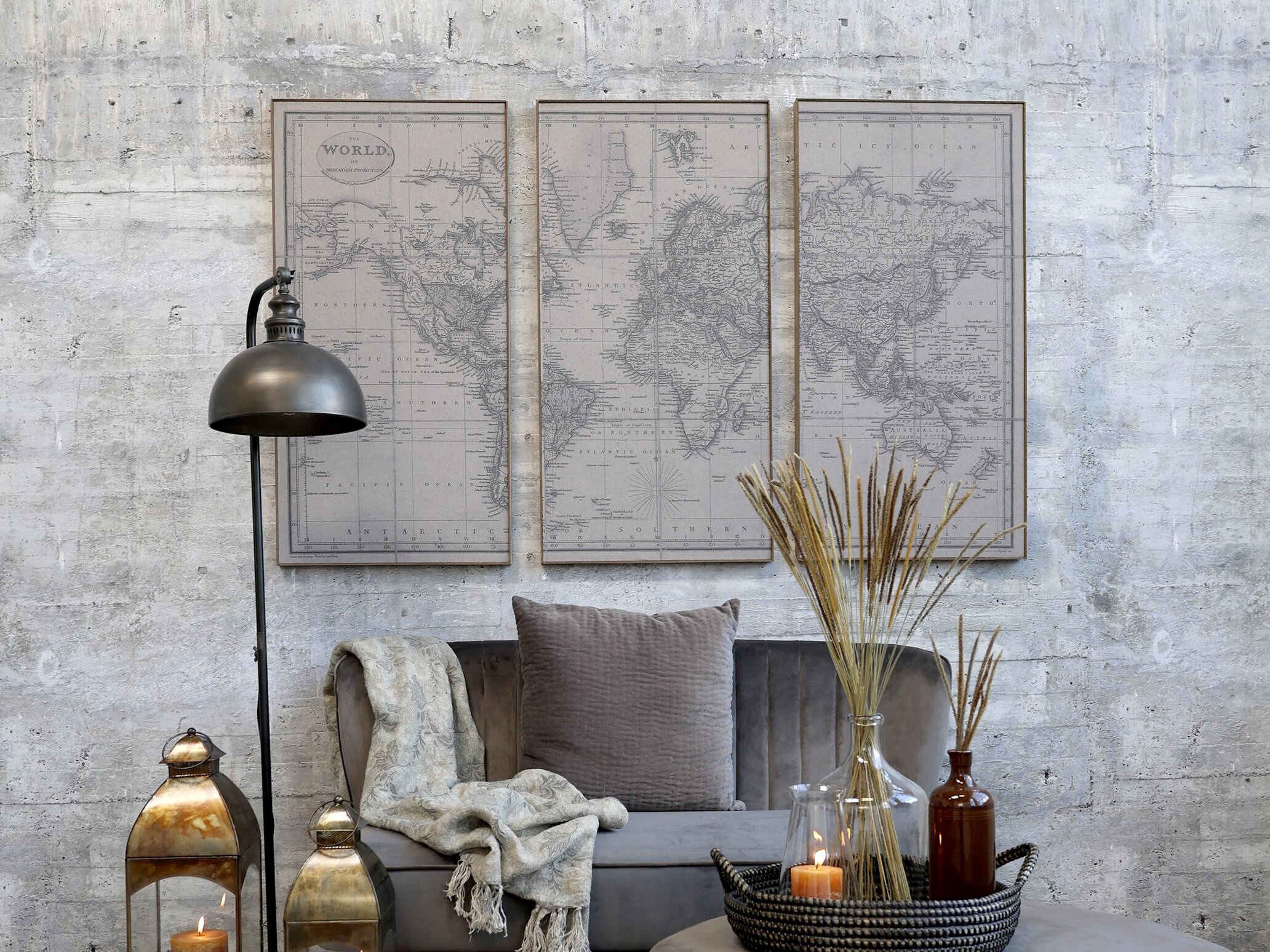 Dekorativ tavla i set om 3 stycken med världens länder & hav, levereras med träram. Från Chic Antique.