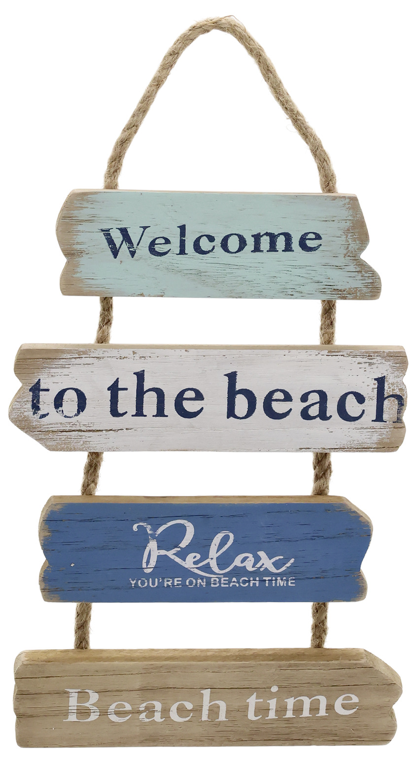 En dekorativ väggskylt i trä med en härlig strandkänsla. De små skyltarna i mjuka blå och naturfärgade toner sitter samman med rep och bildar en charmig dekoration med texterna Welcome, to the beach, Relax och Beach time.