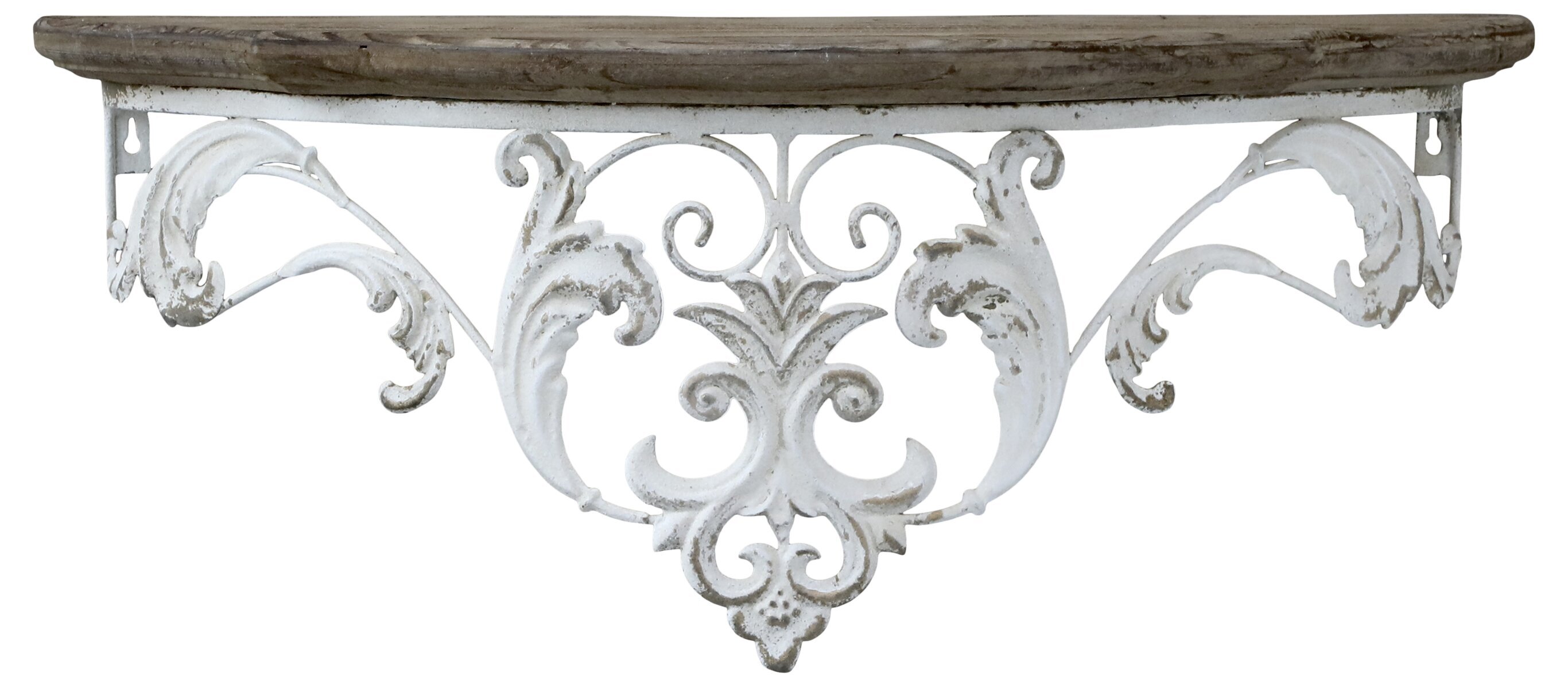 Under hyllplanet finns en intrikat metallkonstruktion som bildar en spetsliknande kant. Metallen har en vit, något patinerad finish, vilket skapar en antik look som ger hyllan sin unika karaktär. Den spetsiga detaljeringen består av svepande kurvor och bladslingor, vilka bildar ett symmetriskt mönster som löper längs hyllans undersida. Denna dekoration ger ett intryck av gammaldags hantverksskicklighet och kan tilltala de som uppskattar vintage och shabby chic-stilar.