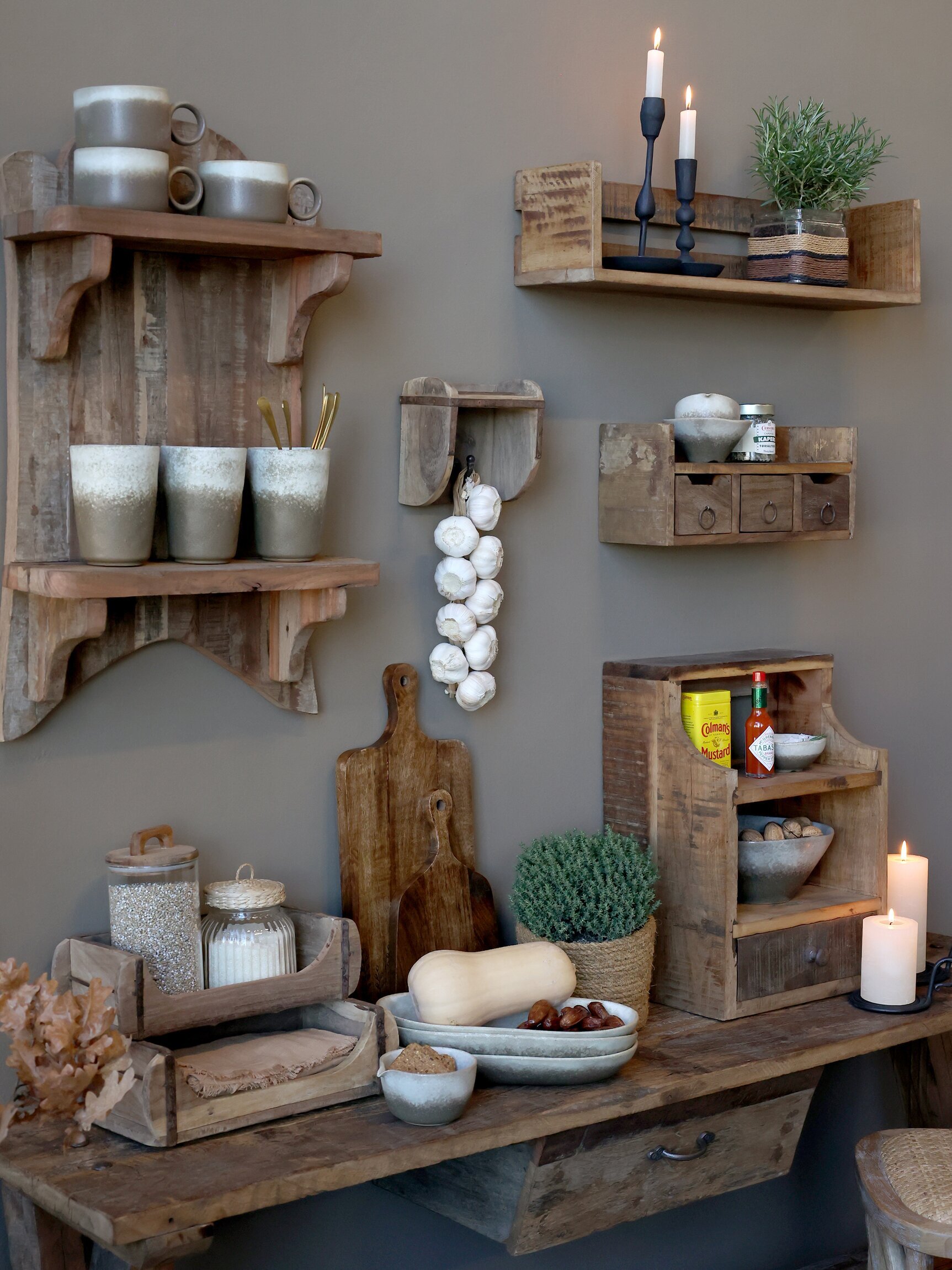 Vägghylla i återvunnet trä med krok – rustik charm för köket. Läs mer