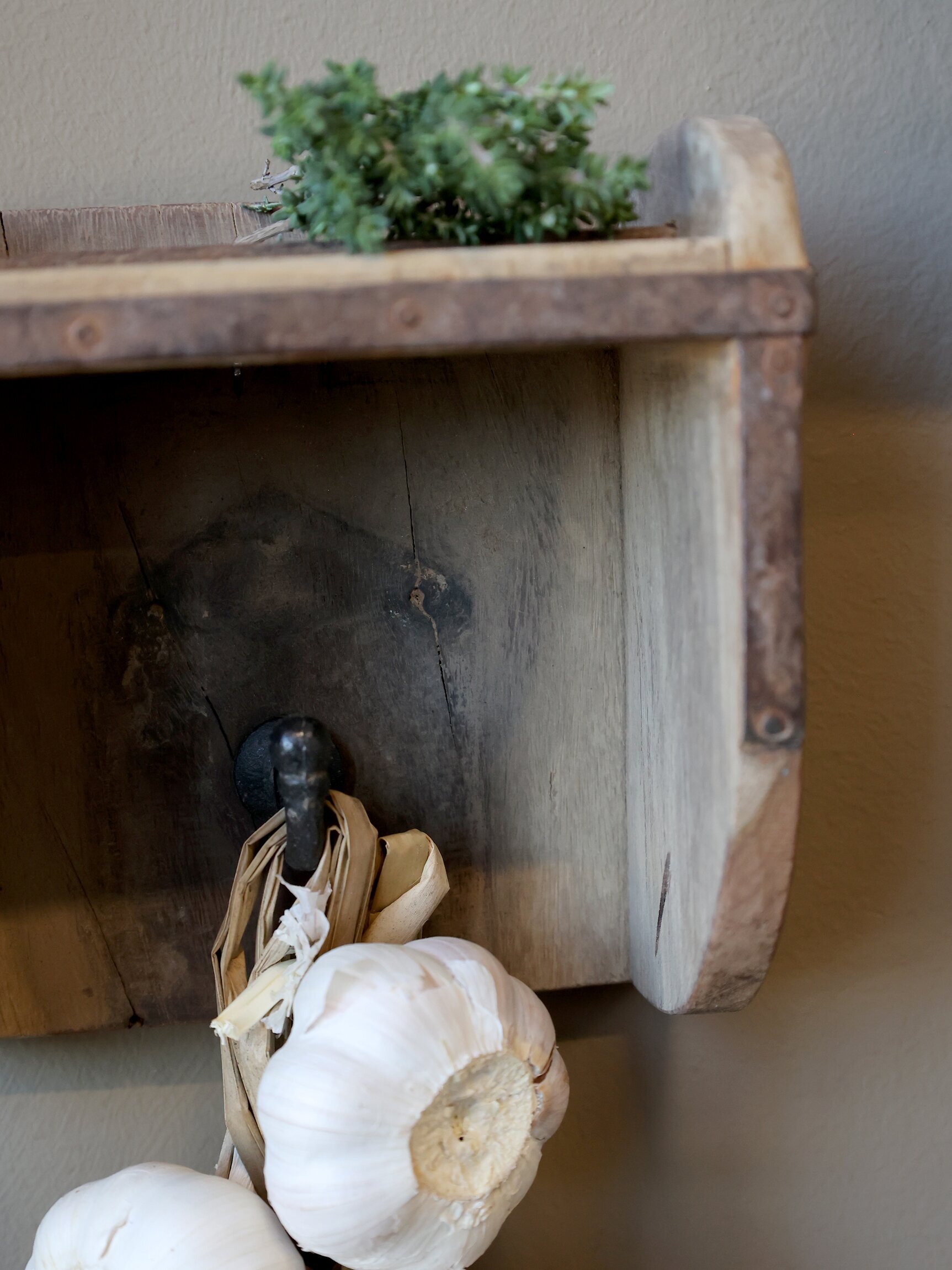 Denna unika vägghylla i återvunnet trä med rustika järndetaljer ger ditt hem en varm och genuin känsla. Hyllan är lika vacker som praktisk – använd den för att ställa små skålar, örter eller ljus, och häng vitlök, kökshanddukar eller annat på den charmiga kroken undertill.