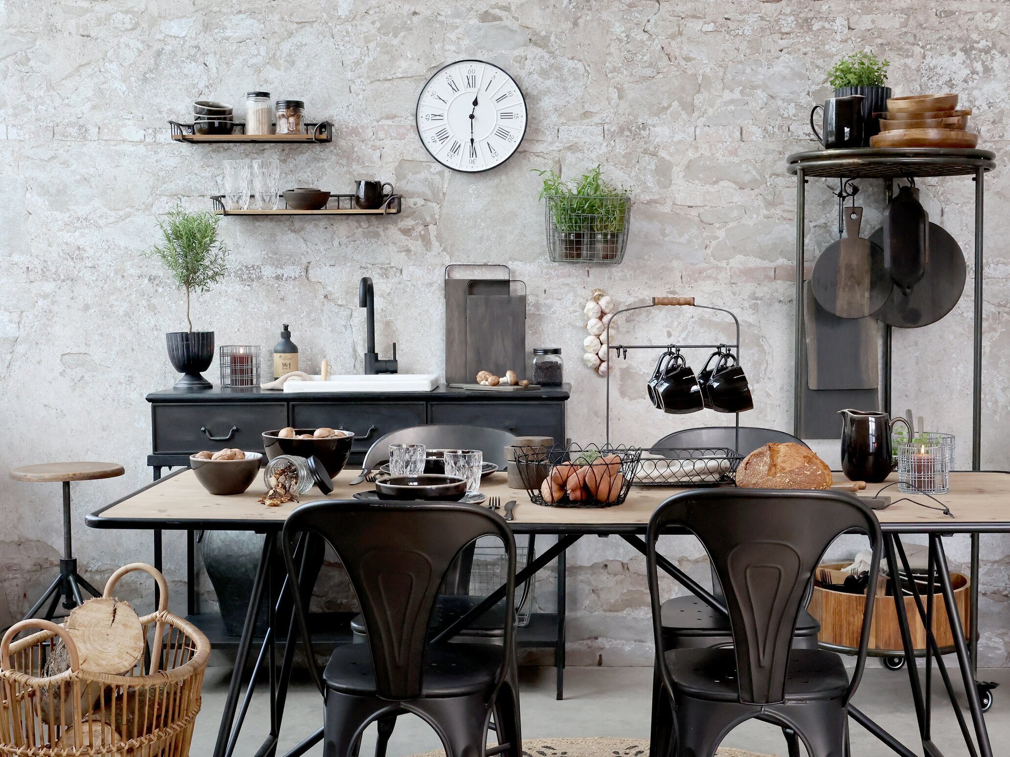 Bilden från Köpstaden.se visar ett charmigt köksrum som utstrålar en rustik och industriell stil. Denna atmosfär är perfekt för den som älskar tidlösa detaljer. Mitt i centrum står ett robust matbord i trä med svarta metallben, kring vilket flera matchande, svarta stolar är placerade. På bordet finns olika typer av porslin och glas, arrangerade på ett inbjudande sätt, tillsammans med en rustik brödkorg och diverse köksredskap.