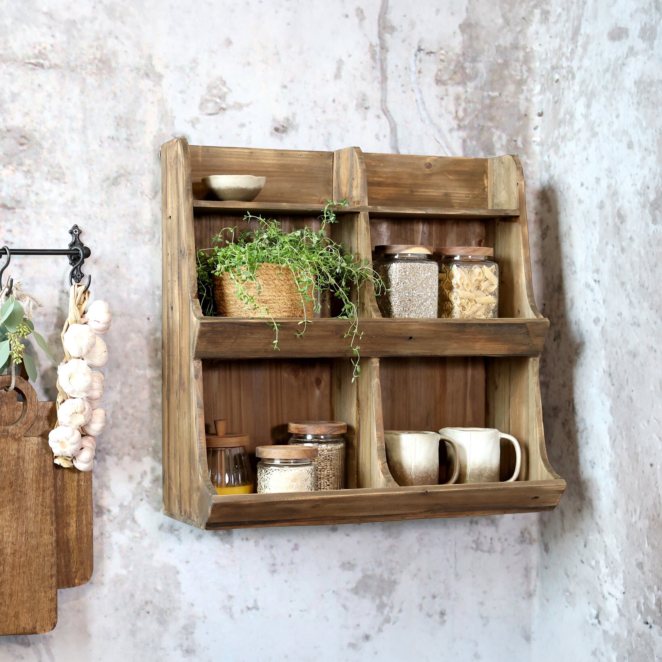 Skapa både ordning och charm med denna väggreol i trä med 6 fack. Den rustika finishen och de mjukt rundade sidorna ger ett varmt och genuint uttryck som passar perfekt i kök, hall eller matplats.