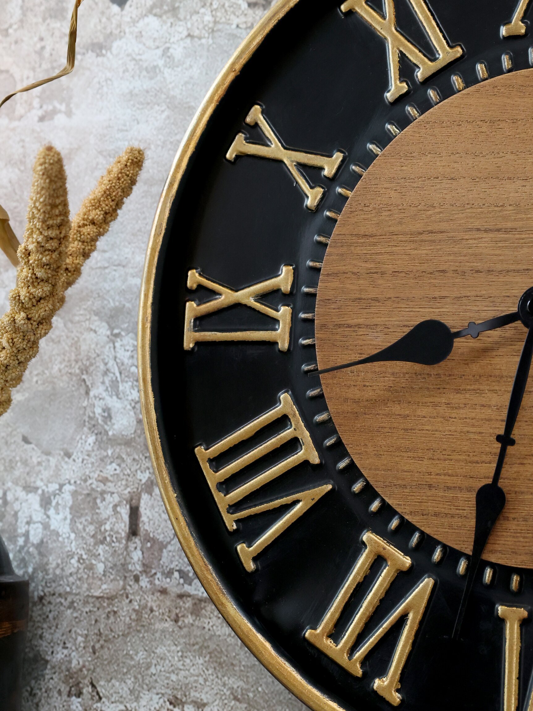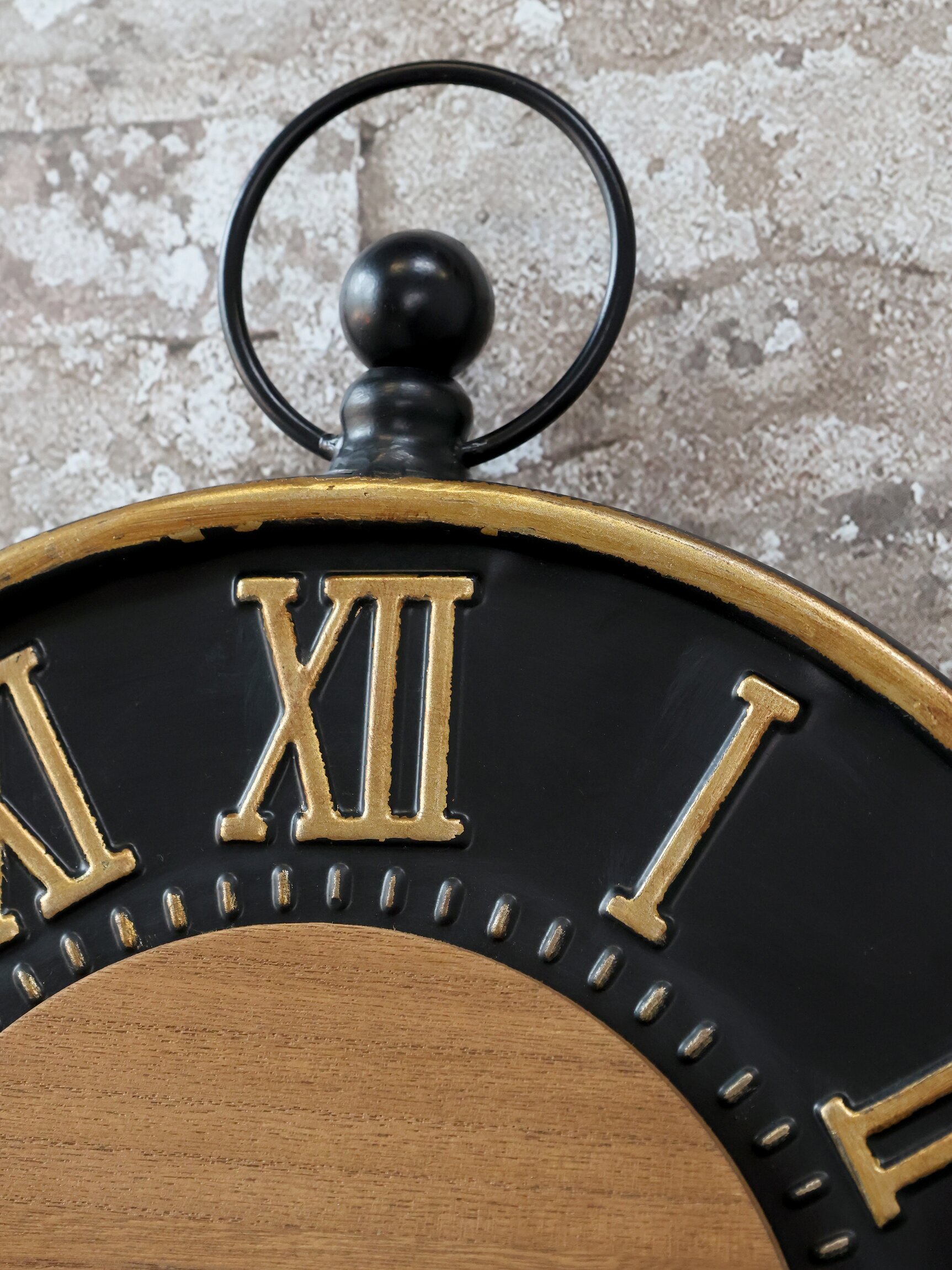 Svart väggklocka med romerska siffror i guld, från Chic Antique.