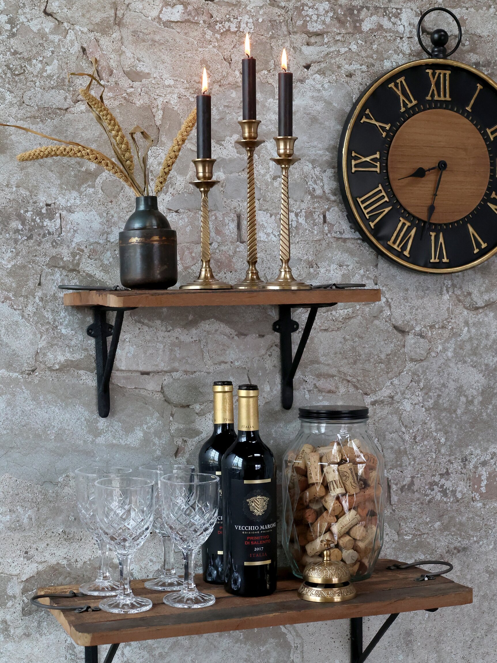Under hyllan finns ytterligare en yta som bär två flaskor rödvin, omgärdade av kristallglas i ett set om fyra. Dessa glas är noggrant slipade vilket reflekterar ljus och tillför en gnistrande effekt. En stor glasburk, fylld med vinkorkar, står bredvid flaskorna som en kreativ dekoration, vilket också indikerar en uppskattning för vinens värld. Intill burken finns en liten ringklocka av mässing, vars design förmedlar en känsla av svunna tider.
