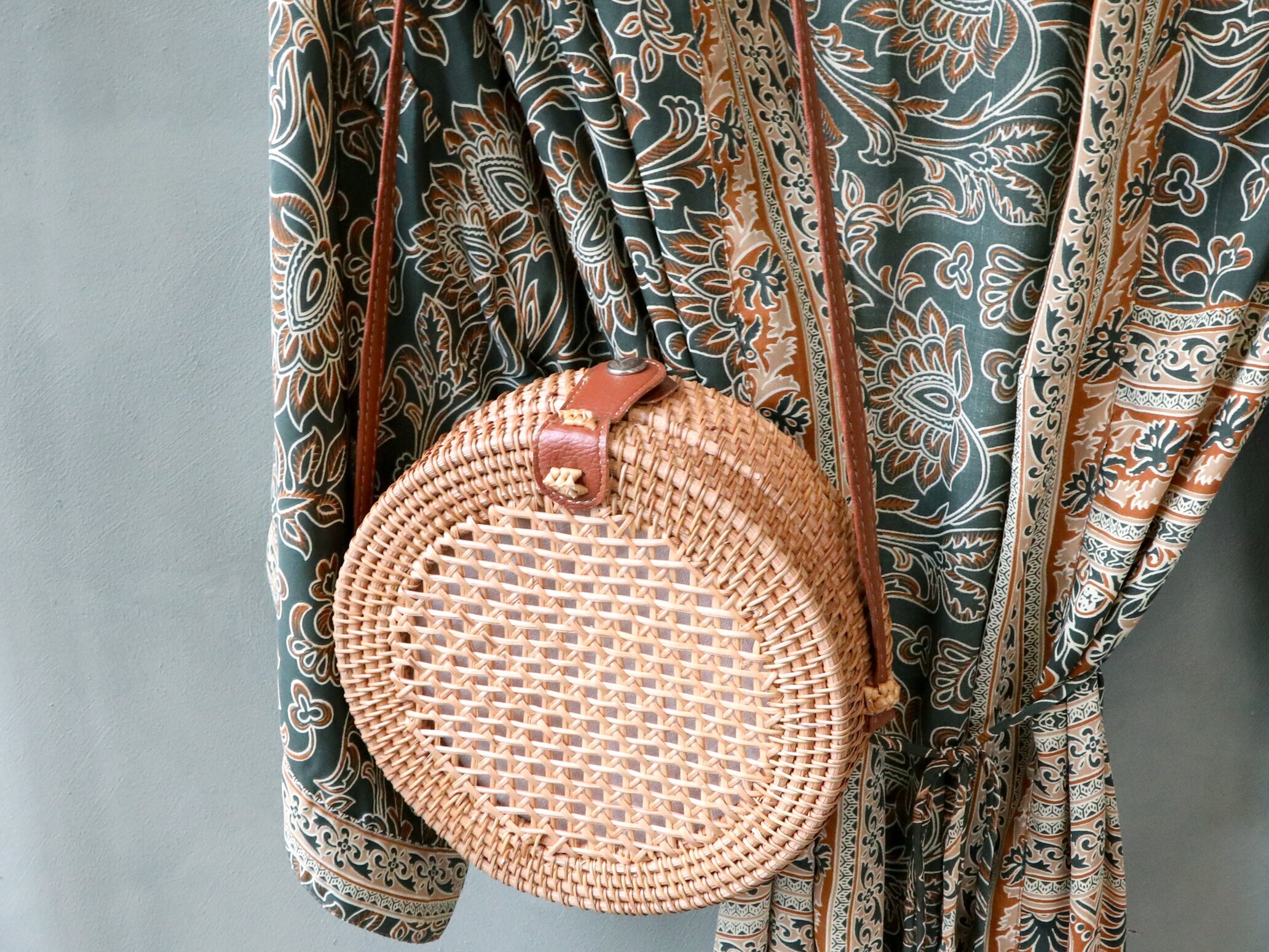 På bilden syns en intrikat vävd väska som hänger släppt på en bakgrund av ett detaljerat mönstrat tyg. Väskan, känd som Väska Bali Flätad Rotting från varumärket Chic Antique, fångar omedelbart uppmärksamheten med sitt runda, kompakta format och robusta hantverk. Den har en varm naturlig färgton, typisk för rottingmaterialet som används i dess konstruktion.