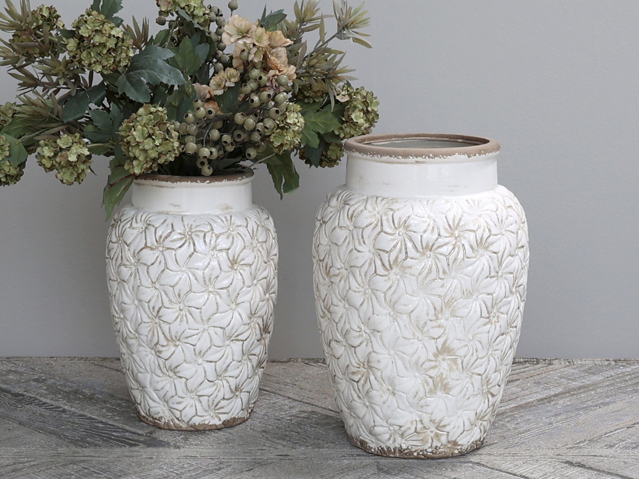 Vasernas yta är täckt av ett upprepat blommönster, vilket ger dem en struktur och djup som fångar ögat. Mönstret består av indenterade blommor som skapar ett dynamiskt skuggspel över vasen. Cremefärgen har subtila inslag av antik finish, vilket ger en känsla av patina som bidrar till deras åldrade uttryck. Denna nyans framhäver både form och ornamentik, vilket gör dem till ett attraktivt tillskott i vilket rum som helst.