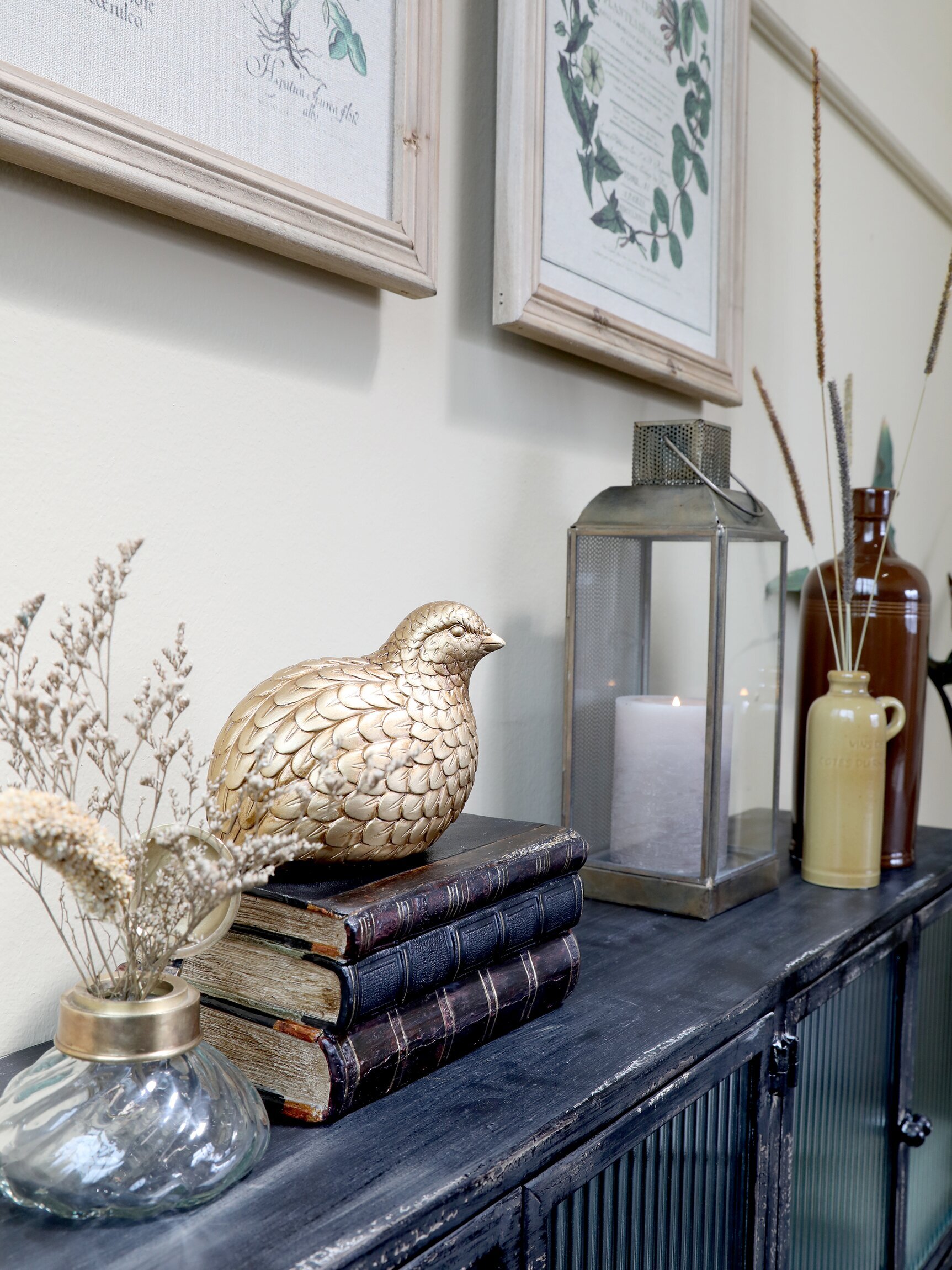 Ovanpå böckerna tronar en gyllene dekoration i form av en fågel, vars detaljerade fjäderdräkt fångar ljuset och skapar en varm glöd. Ljuset reflekterar subtilt mot de gyllene tonerna, vilket drar blicken till denna centrala del av arrangemanget. I bakgrunden finns en hög, fyrkantig lykta av metall, där ett tjockt vitt ljus bidrar till en mysig atmosfär.