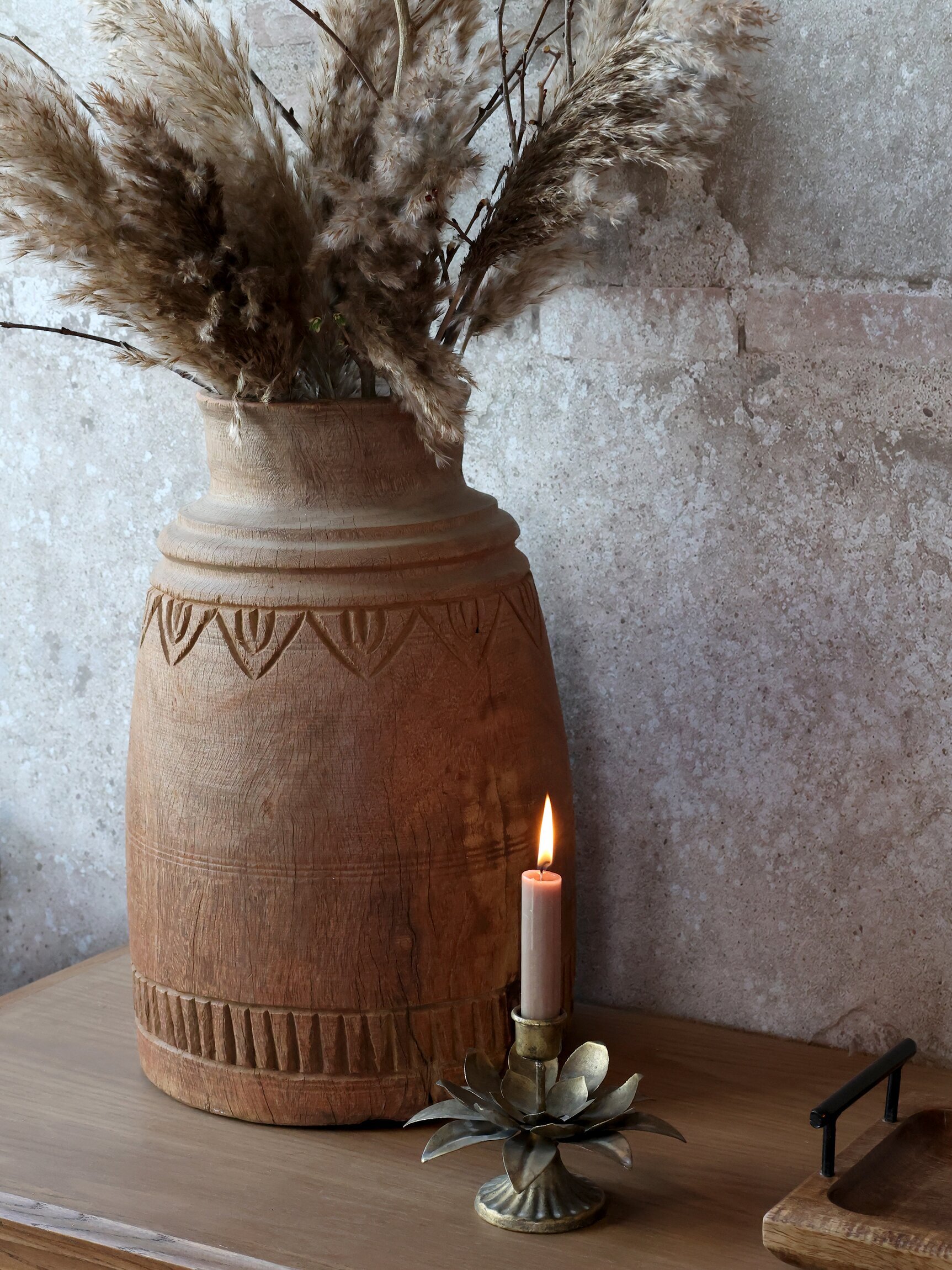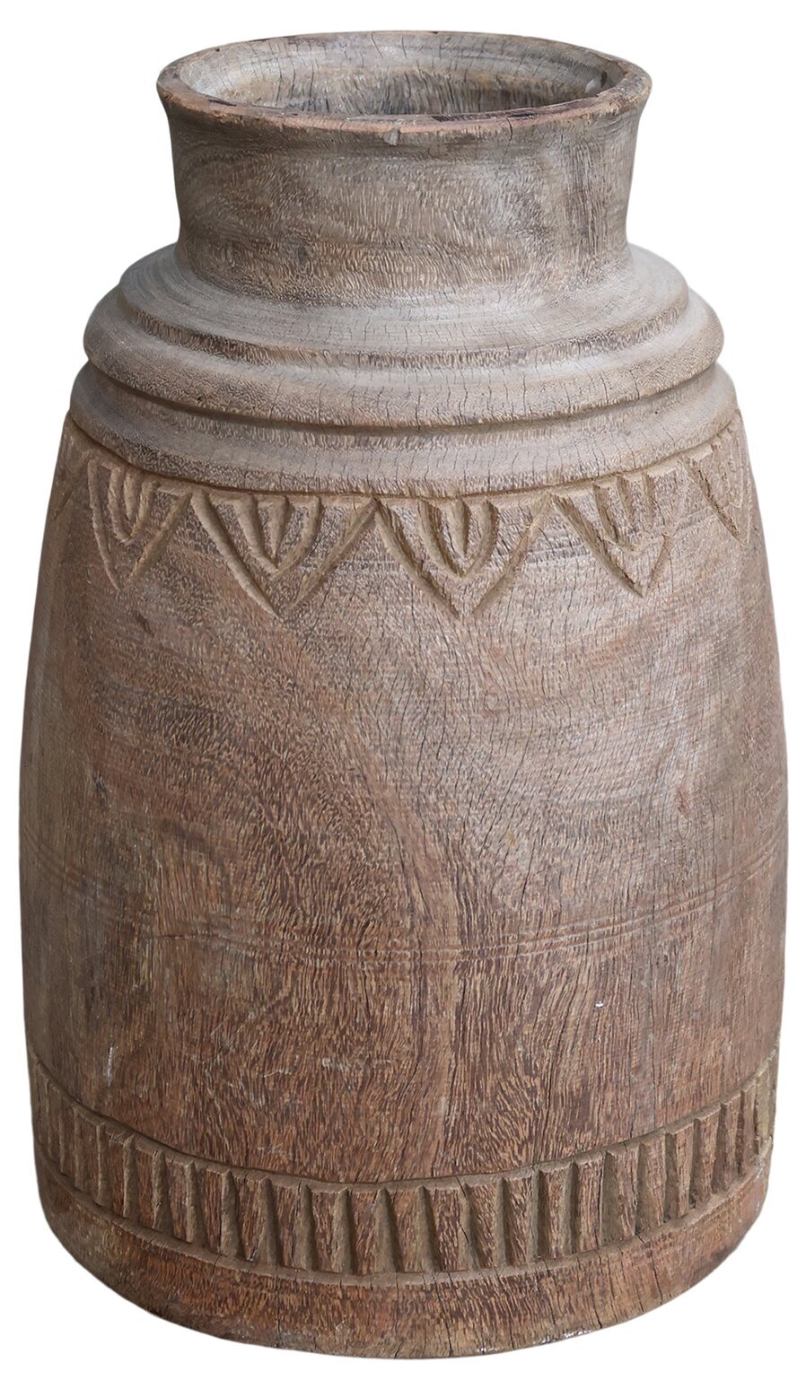 Stor & rustik vas i återvunnet trä, tidigare använd i bergsbyar i Indien till skydd av ris, vete & salt. Vaserna är tillverkade för hand av återvunnet trä med vackra detaljer & mönster.
