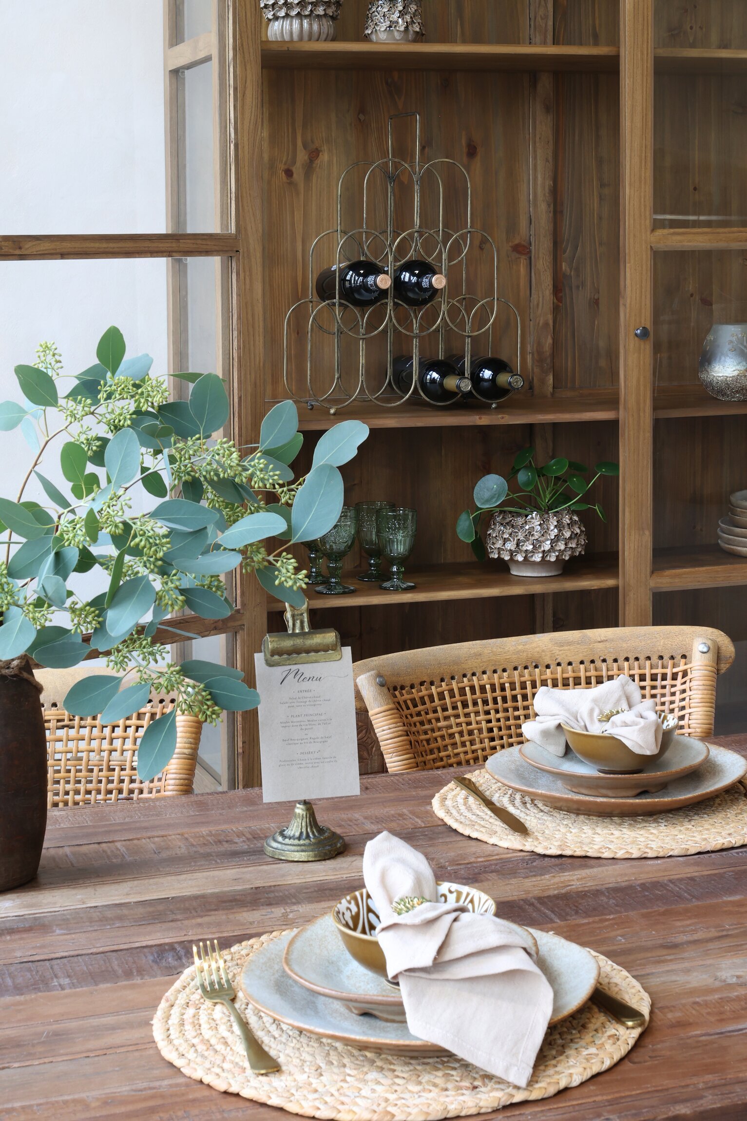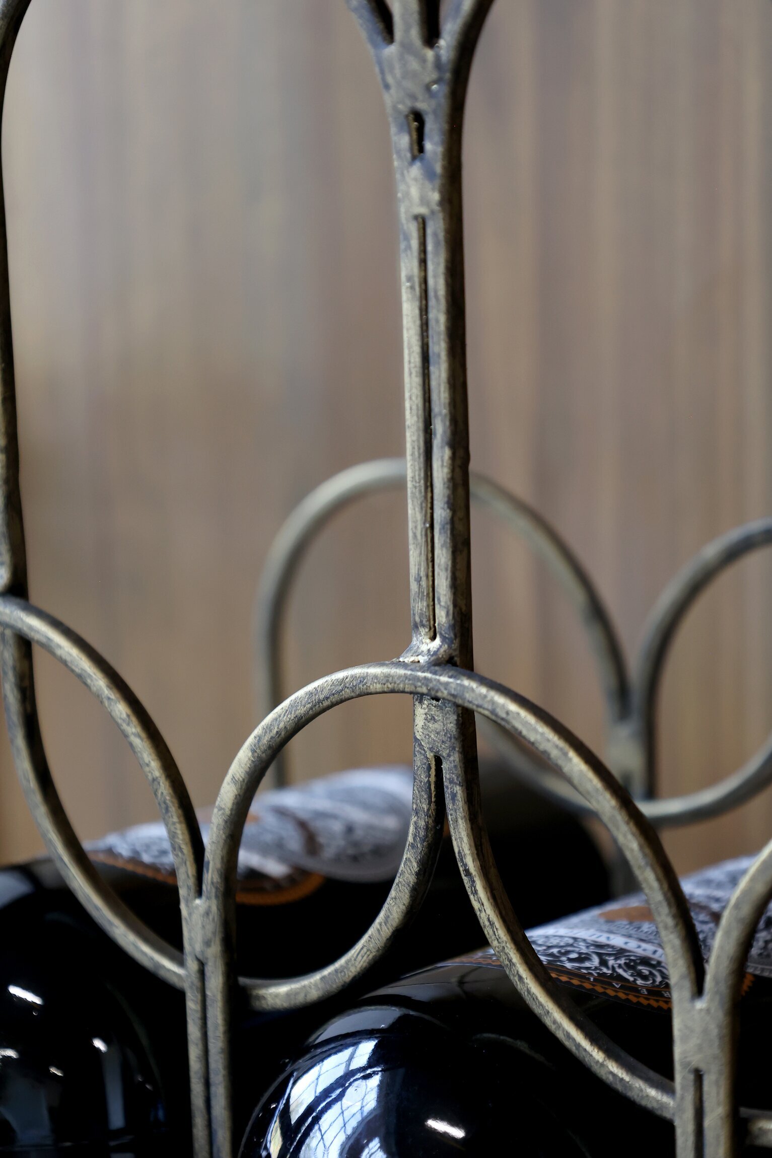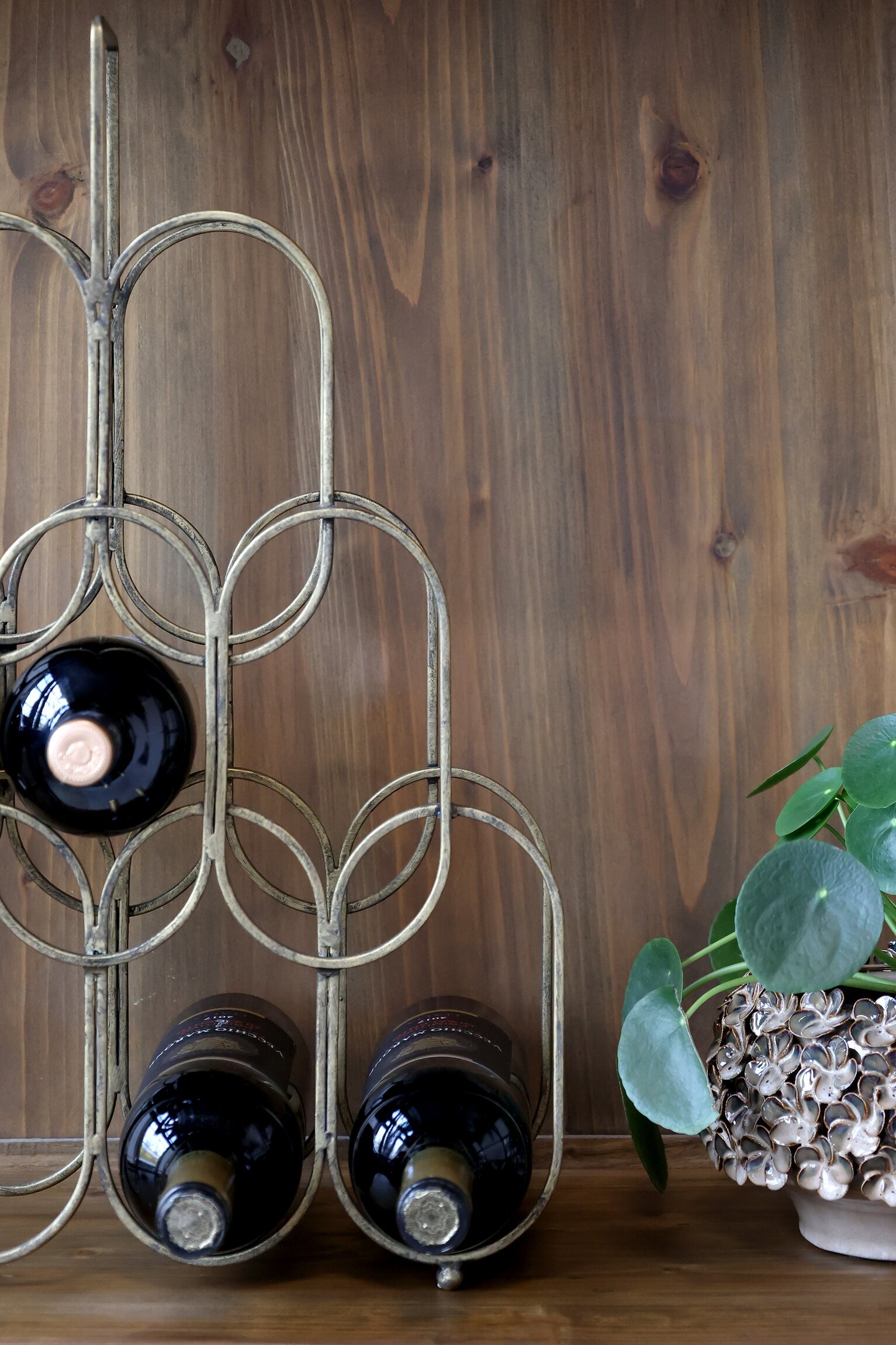 Den antikbehandlade finishen skapar en sofistikerad känsla som passar lika fint i matsalen som i köket eller på en öppen hylla. Flaskorna ligger stabilt och horisontellt, vilket både är praktiskt och visuellt tilltalande.