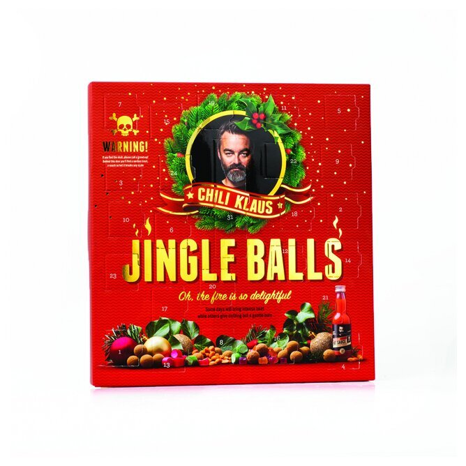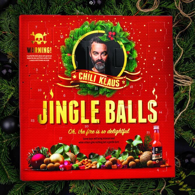 Adventskalender Jingle Balls innehåller 25 stycken luckor med överraskningar, allt från vingummi, lakrits, hårda karameller, & chokladkulor smaksatta med chili.