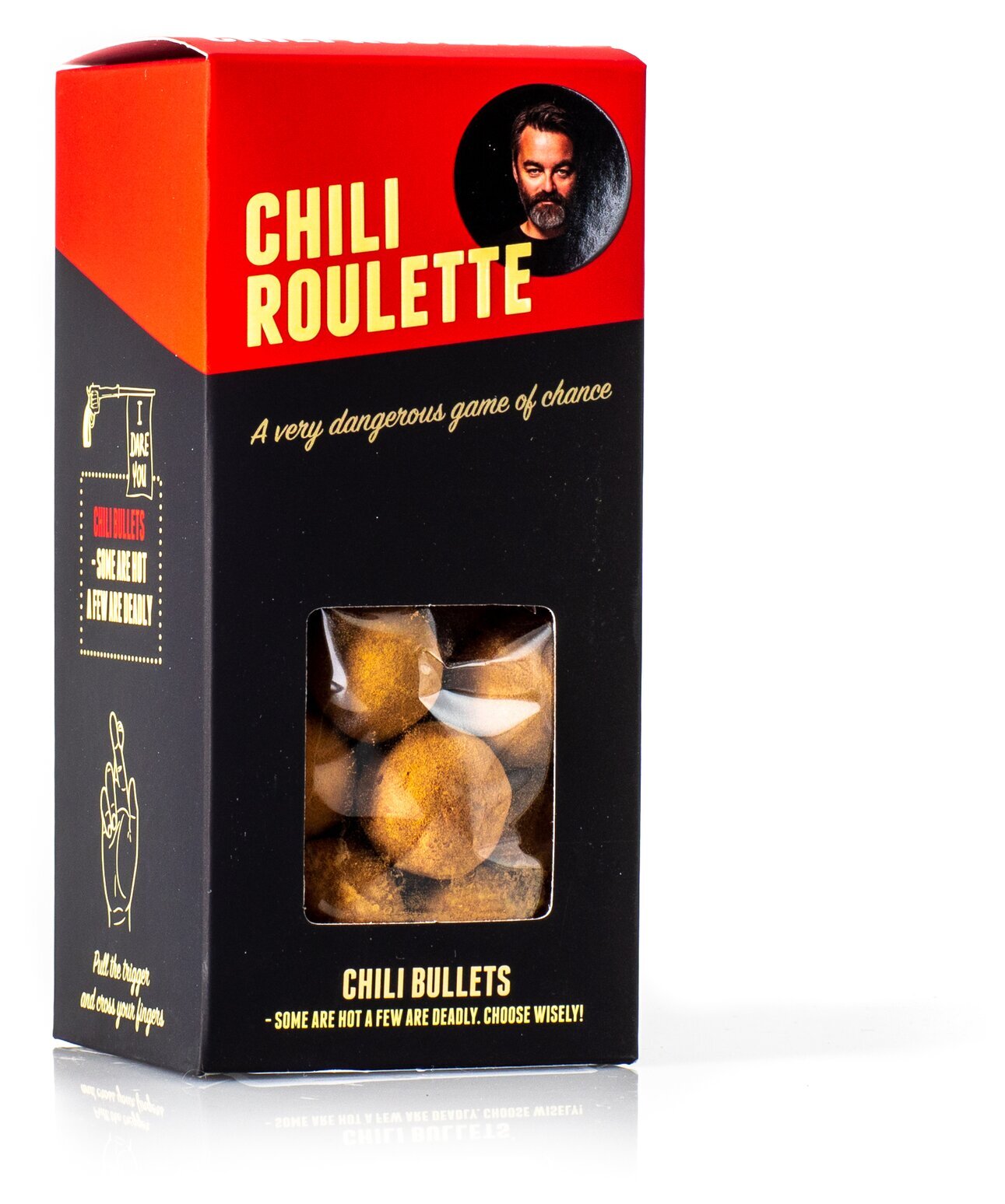 På framsidan av förpackningen finns titeln "Chili Roulette" i stora, gula bokstäver som kontrasterar mot bakgrunden. Under denna rubrik står texten "A very dangerous game of chance", vilket skapar en känsla av spänning och lekfullhet. Förpackningen har en rektangulär form och är designad för att bekvämt få plats i hyllor och skåp.