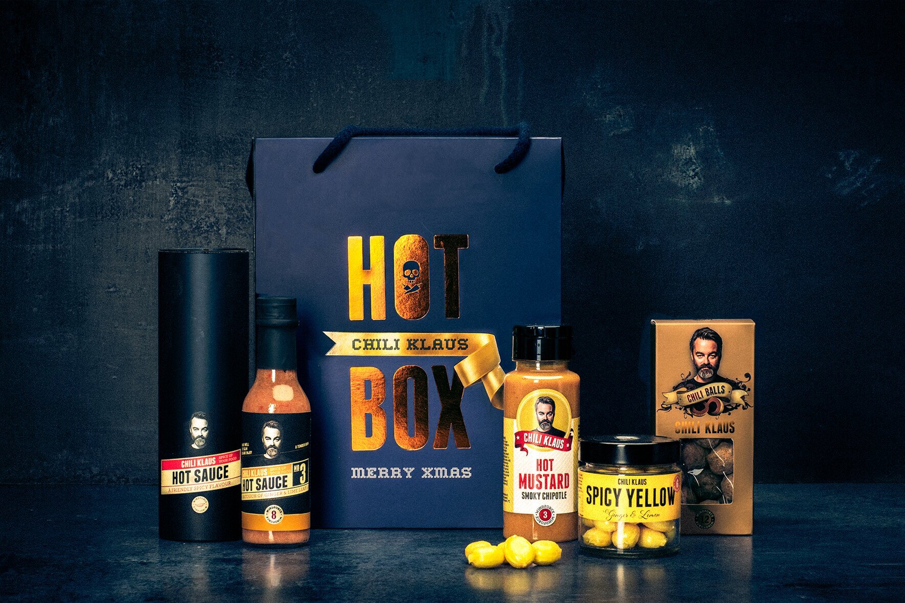 Längst till höger syns en kartongförpackning med texten Chili Balls, vilken innehåller choklad eller andra smaksatta delikatesser. Bilden på förpackningen föreställer en ansiktsbild av Klaus, varumärkets maskot, något som ger produkten en personlig touch.