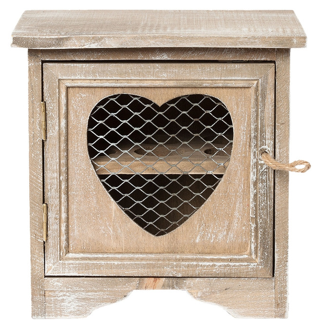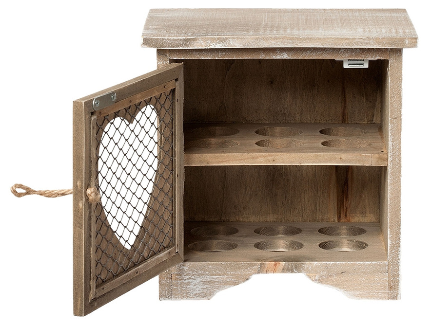 Ett charmigt äggskåp i trä med rustik och lantlig känsla. Skåpet har en dekorativ dörr med hjärtformad öppning och nät, vilket ger det ett hemtrevligt och klassiskt uttryck. Den slitna finishen förstärker den genuina känslan och gör det till en fin detalj i köket.
